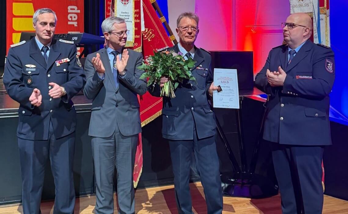Neben dem Rückblick standen Anerkennung und Dank im Mittelpunkt. Zahlreiche Kameradinnen und Kameraden wurden für langjährige Treue geehrt, 60 Beförderungen ausgesprochen. Die Feuerwehrehrenspange der Stadt Ludwigsfelde in Gold erhielten Werner Fank und Michael Hötzel – stellvertretend für viele, die über Jahrzehnte Verantwortung übernommen haben. Bürgermeister Andreas Igel würdigte den „unermüdlichen Dienst am Gemeinwohl“ und sprach der Wehr höchsten Respekt aus.