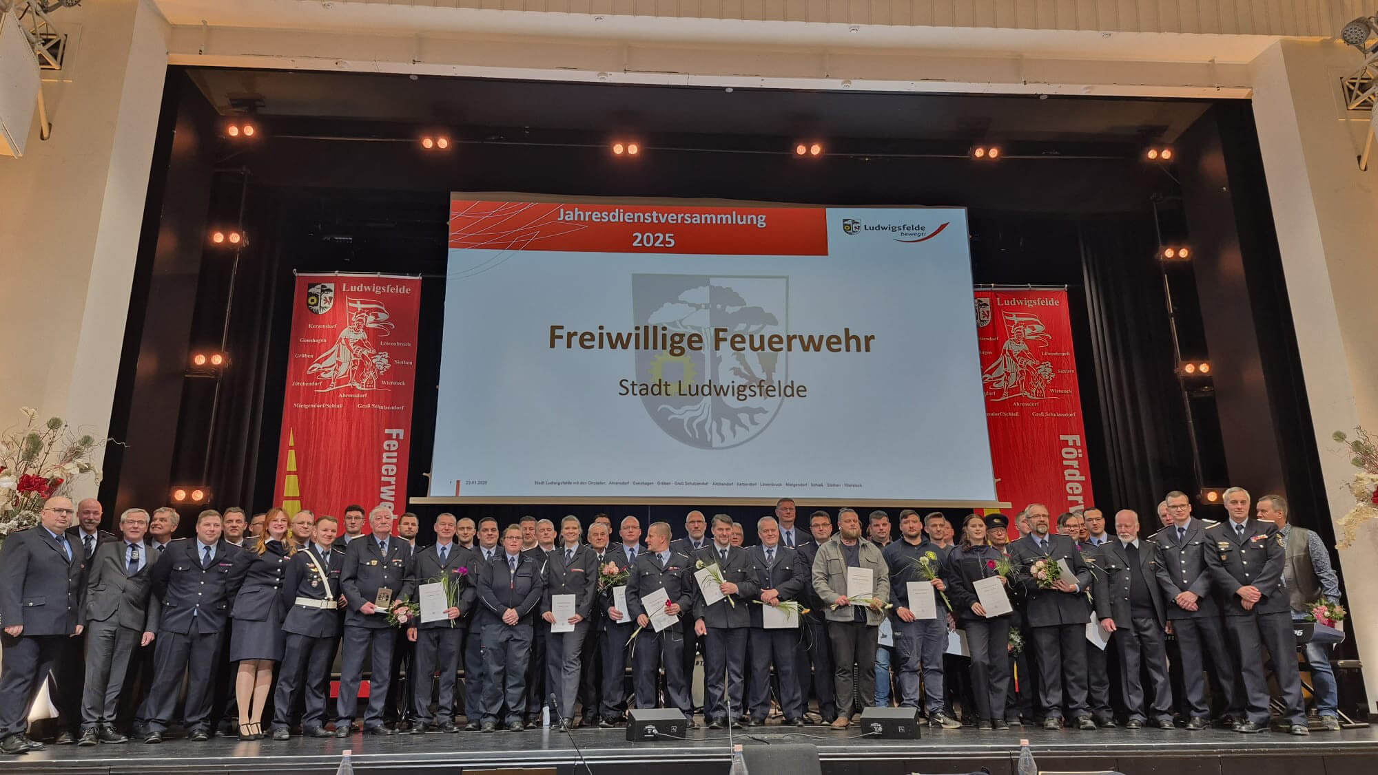 Mehr als 200 Kameradinnen und Kameraden kamen zur Jahresdienstversammlung der Freiwilligen Feuerwehr Ludwigsfelde zusammen – ein eindrucksvolles Zeichen für den Zusammenhalt und die Bedeutung des Ehrenamtes in unserer Stadt. Gemeinsam mit Gästen aus Politik, Feuerwehr und Wirtschaft, darunter Bürgermeister Andreas Igel und Kreisbrandmeister Silvio Kahle, blickte Stadtwehrführer Patrice Fischer auf ein intensives Jahr zurück. Nach dem feierlichen Einmarsch der Traditionsfahnen wurde in einer Gedenkminute der im Jahr 2025 verstorbenen Kameraden gedacht – ein stiller Moment des Respekts und der Verbundenheit.