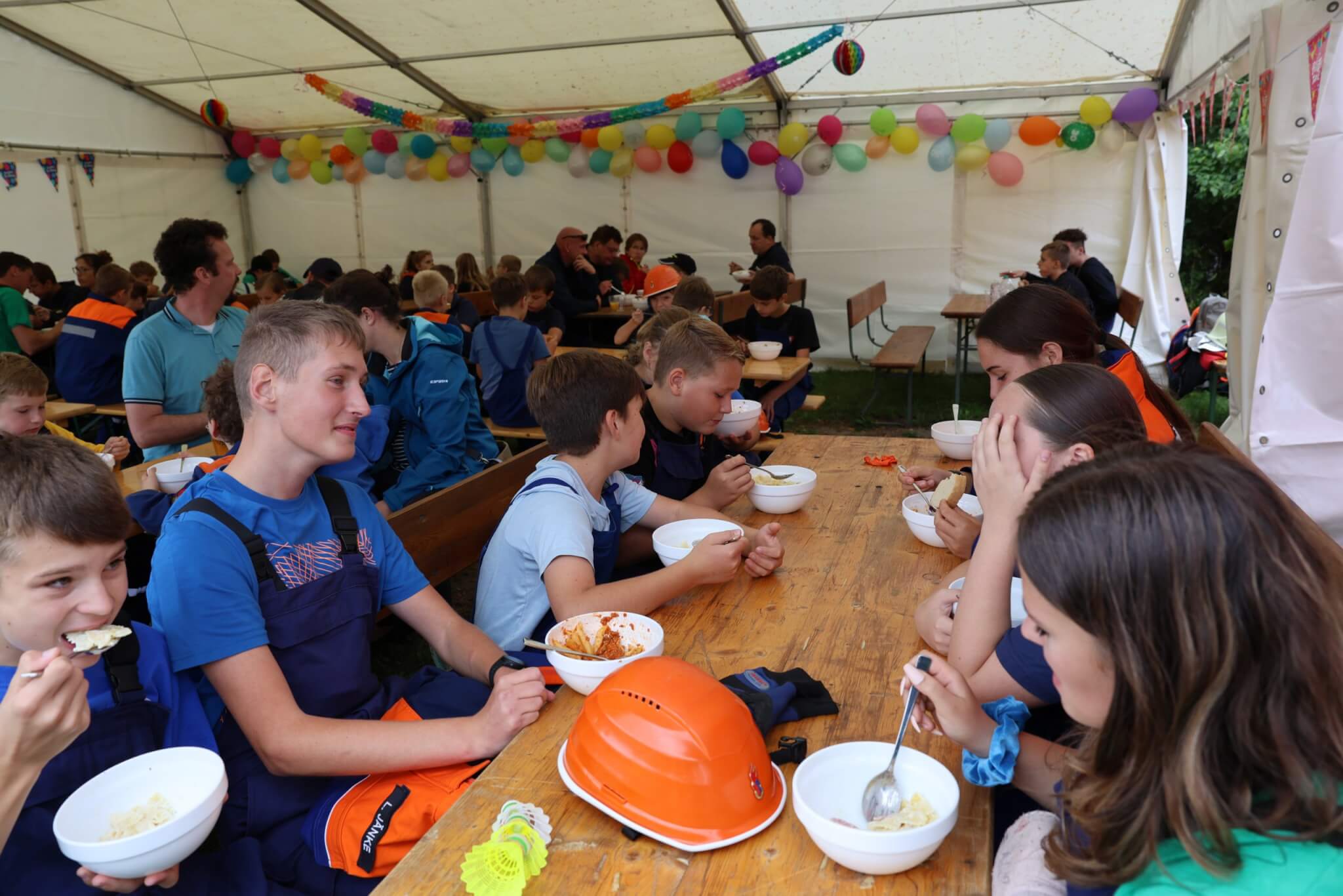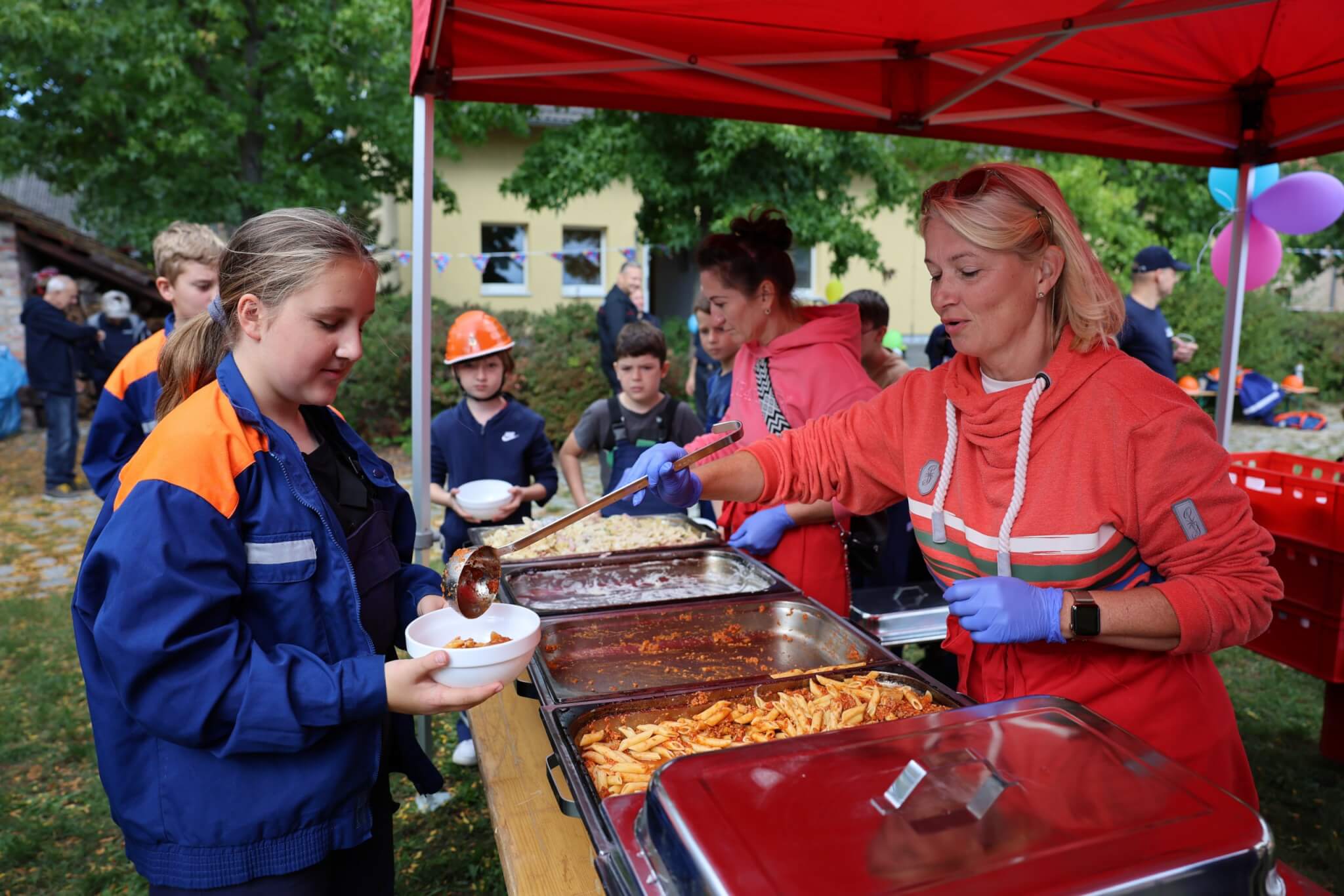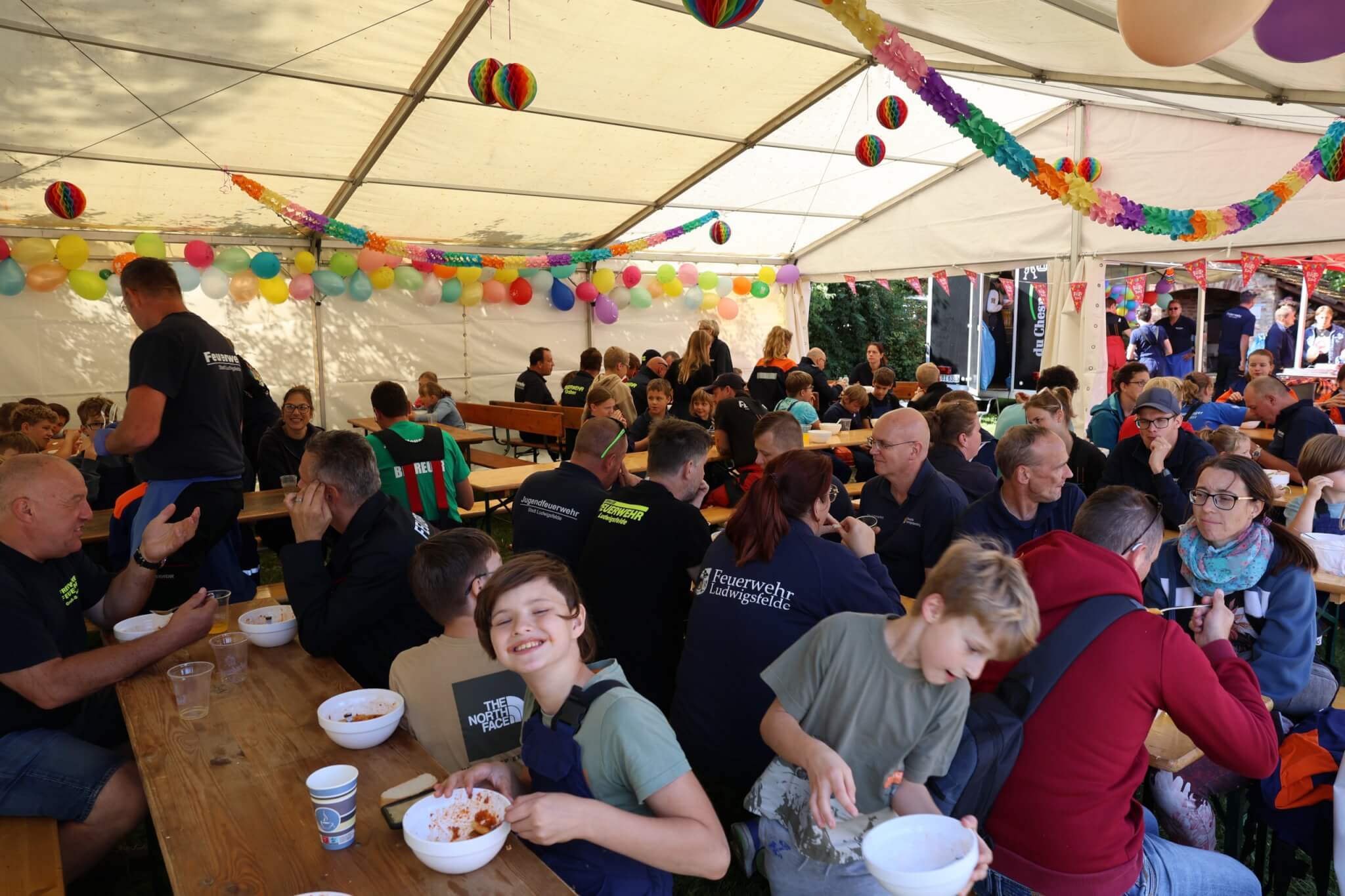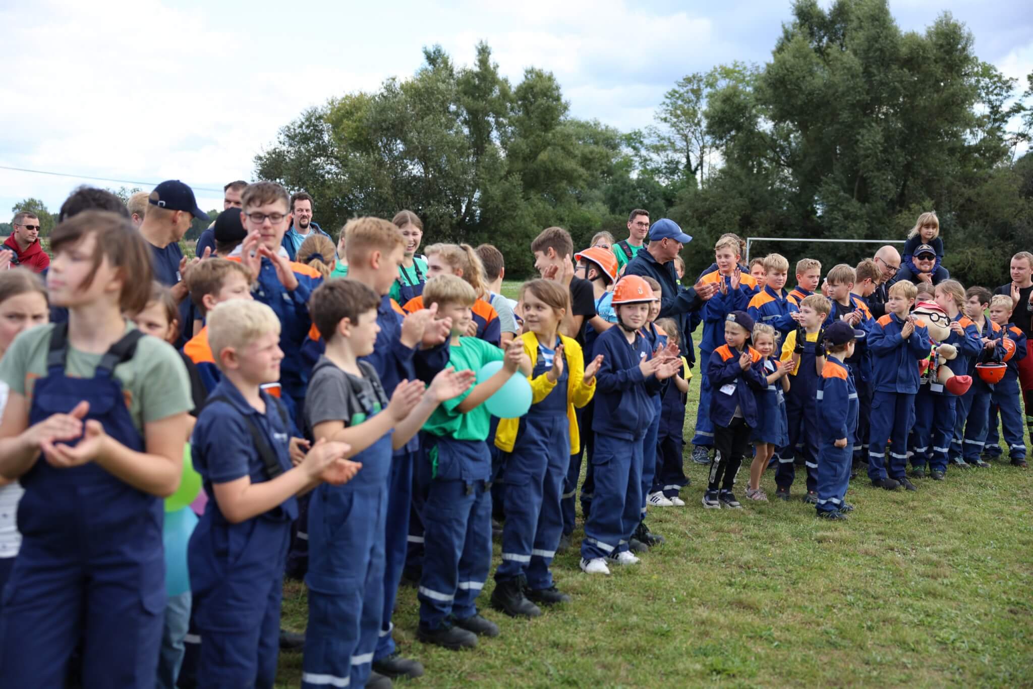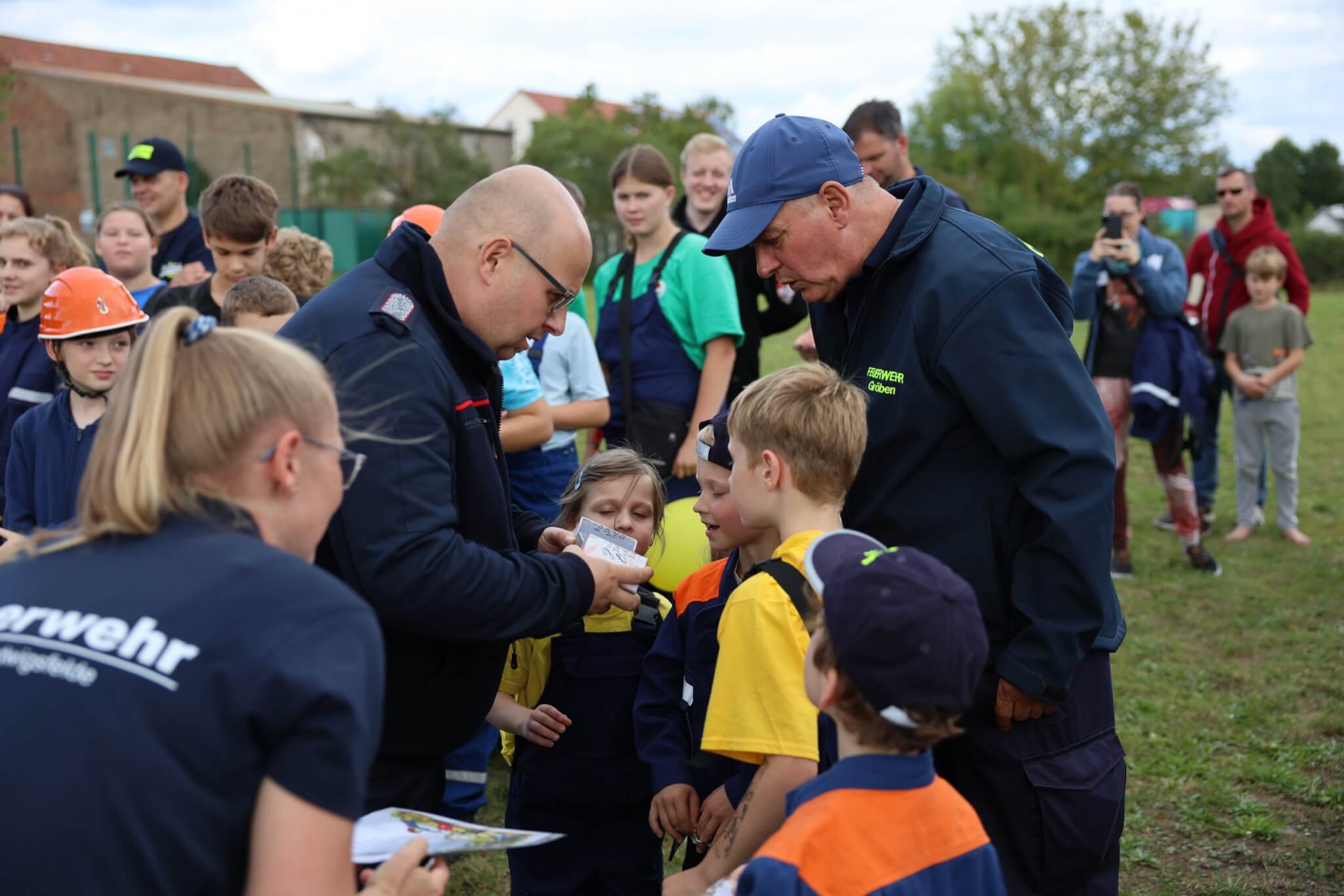 Im Fokus der Veranstaltung stand dennoch ein speziell für die Festivität konzipierter JugendfeuerwehrContest, bei welchem die Kinder- und Jugendfeuerwehrkamerad*innen sowohl ihr theoretisches Fachwissen als auch ihre praktischen Fähigkeiten unter Beweis stellen konnten und zudem die anwesenden Wertungsrichter*innen mit ihrem vorhandenen Spaßlevel, wie zum Beispiel bei der Absolvierung des Wasserbomben-Kübelspritzen-Spieles, überzeugten. Das eigens für das Jubiläumsfest entworfene Memory-Kartenspiel „Fahrzeugkunde“ vom Werbewerk erstaunte und erfreute die Wettkampfteilnehmer*innen ebenso wie die Wertungsrichter*innen. Nach dem Jugendfeuerwehr-Contest hieß es für alle Beteiligten, die erloschenen Reserven mit einem Teller Pasta sowie Getränken für das freie Spiel- und Spaßangebot aufzufüllen. Unmittelbar vor der Siegerehrung kamen Groß und Klein in den weiteren Genuss von der Geburtstagstorte des Bürgermeisters sowie vom Blechkuchen des regionalen Bäckermeisters zu probieren.