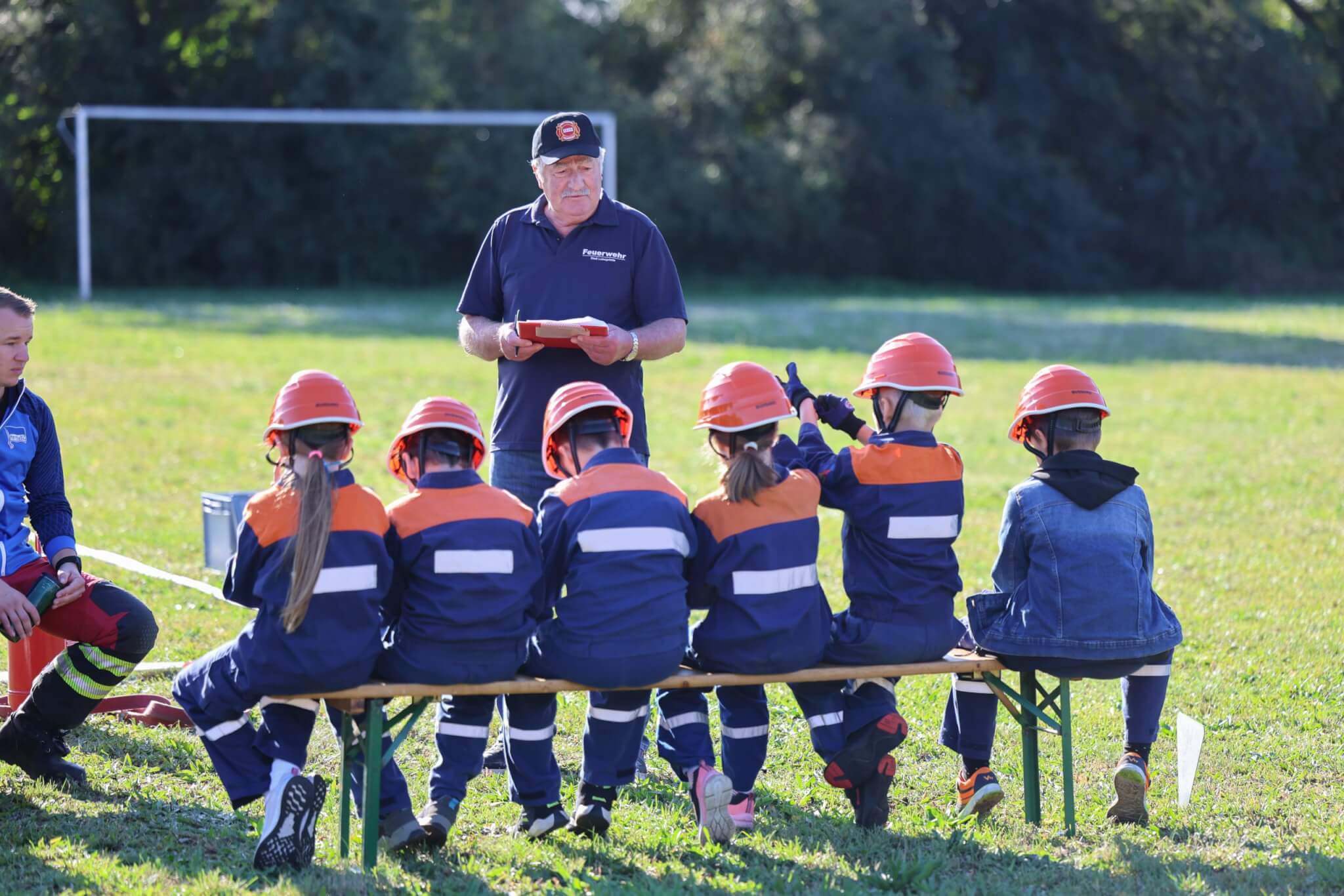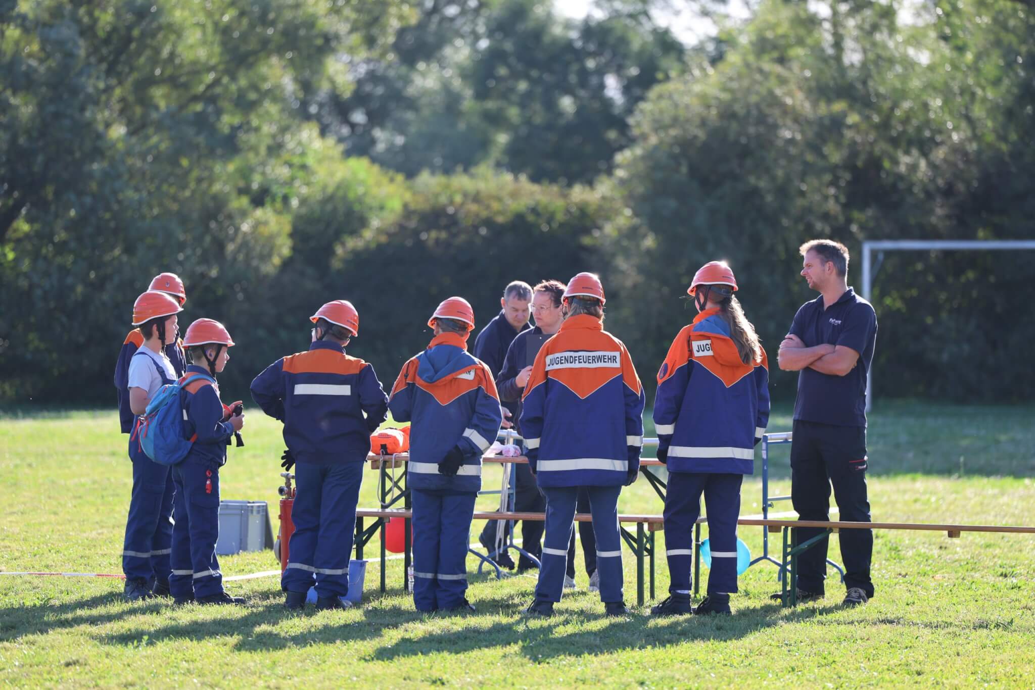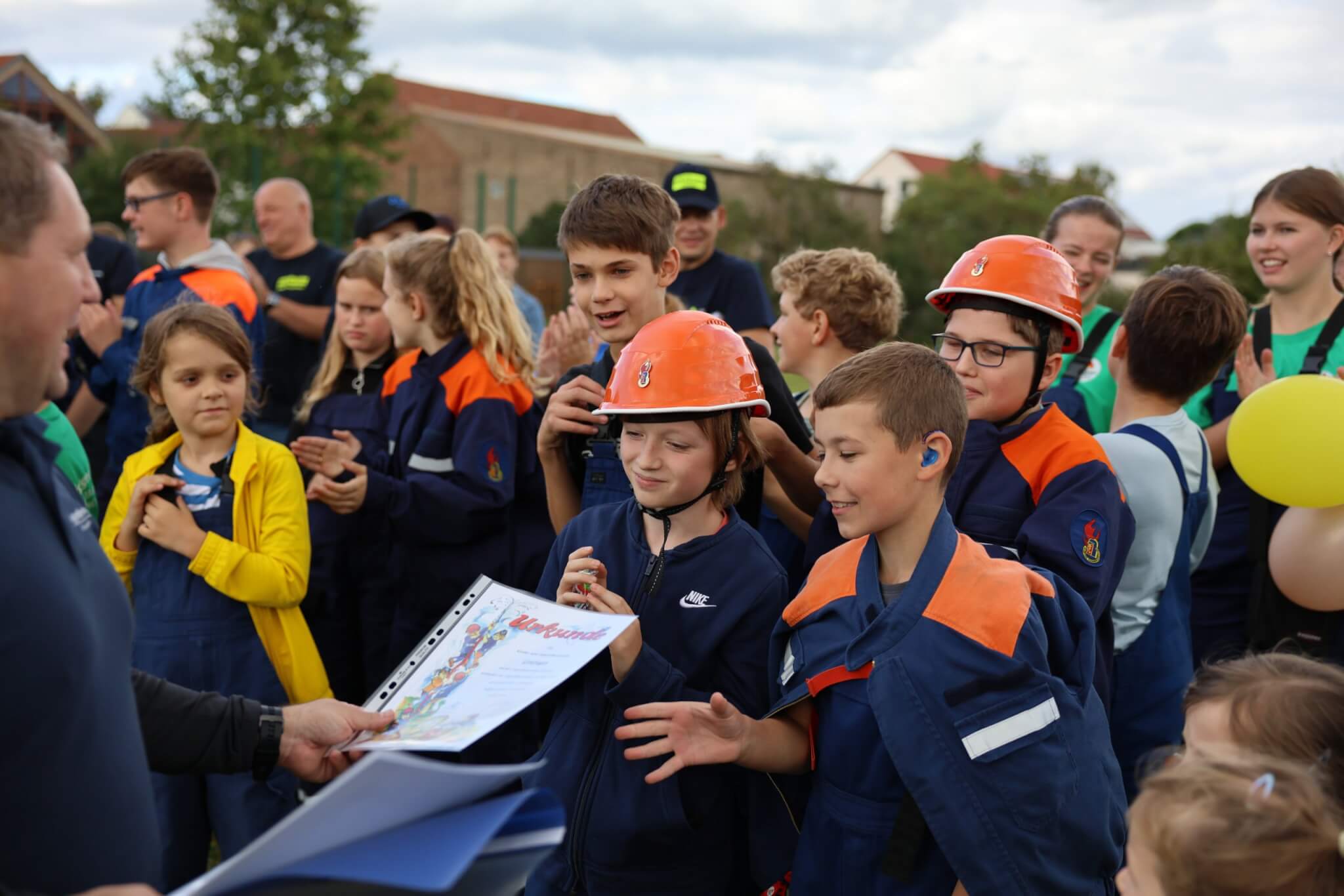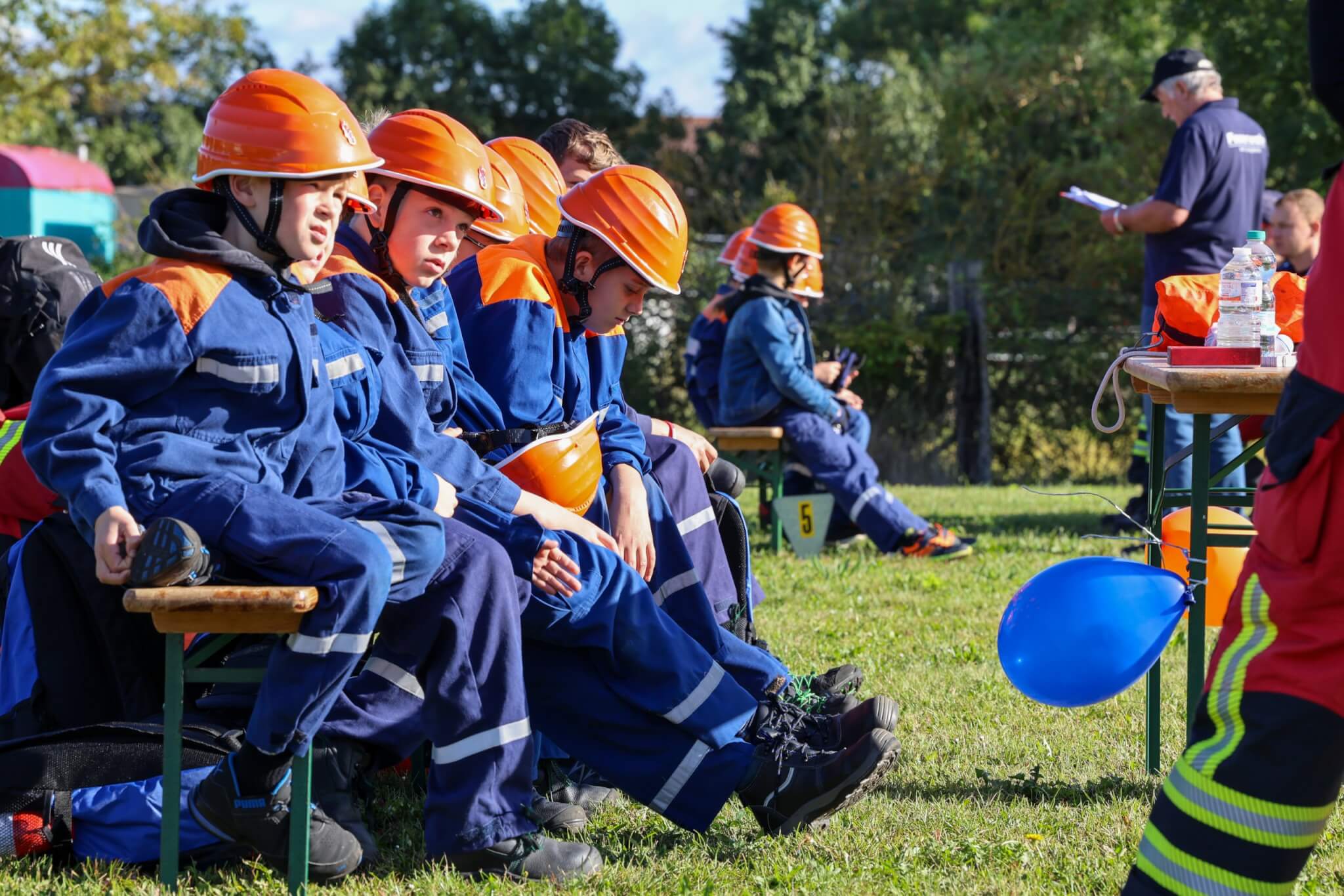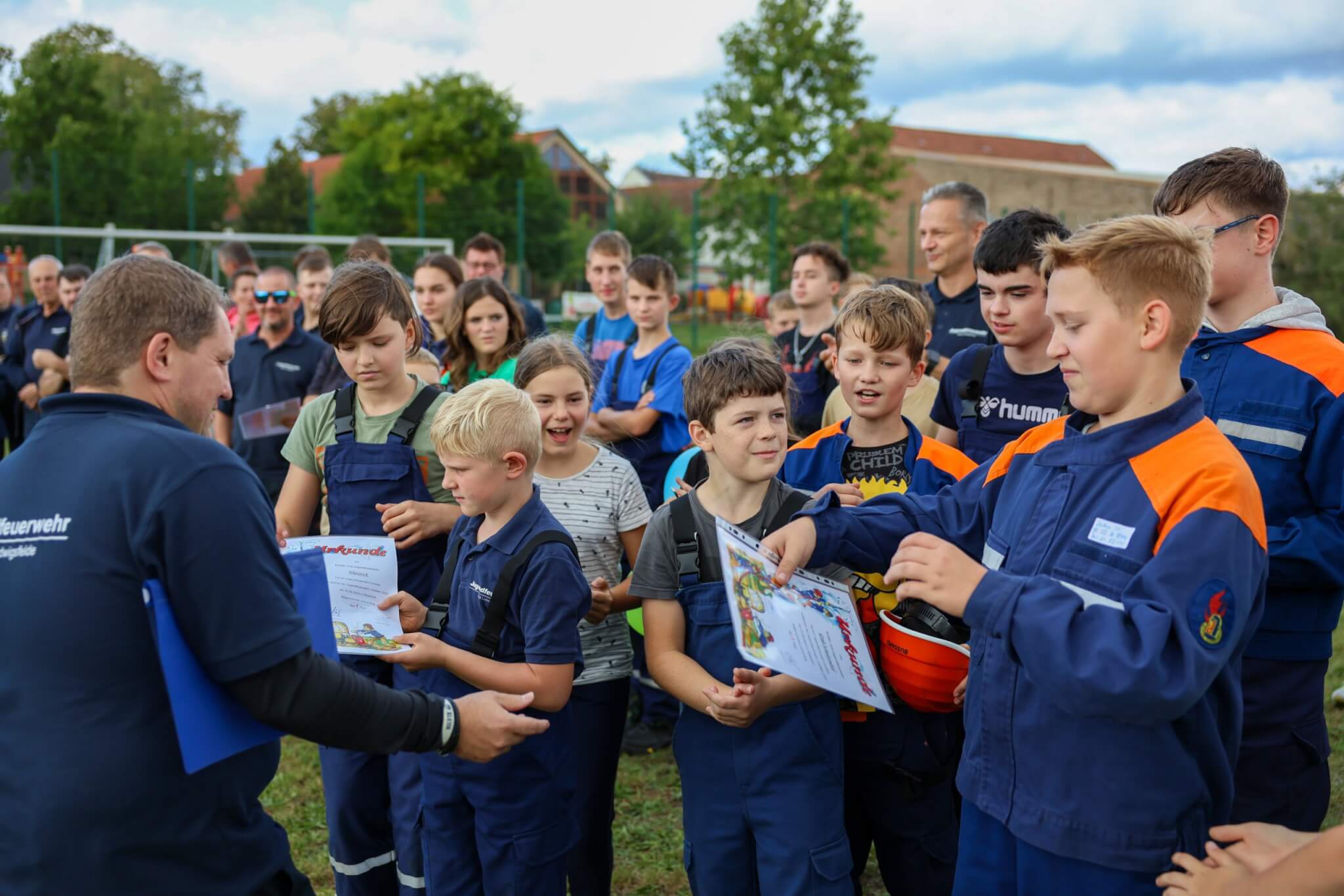 Im Fokus der Veranstaltung stand dennoch ein speziell für die Festivität konzipierter JugendfeuerwehrContest, bei welchem die Kinder- und Jugendfeuerwehrkamerad*innen sowohl ihr theoretisches Fachwissen als auch ihre praktischen Fähigkeiten unter Beweis stellen konnten und zudem die anwesenden Wertungsrichter*innen mit ihrem vorhandenen Spaßlevel, wie zum Beispiel bei der Absolvierung des Wasserbomben-Kübelspritzen-Spieles, überzeugten. Das eigens für das Jubiläumsfest entworfene Memory-Kartenspiel „Fahrzeugkunde“ vom Werbewerk erstaunte und erfreute die Wettkampfteilnehmer*innen ebenso wie die Wertungsrichter*innen. Nach dem Jugendfeuerwehr-Contest hieß es für alle Beteiligten, die erloschenen Reserven mit einem Teller Pasta sowie Getränken für das freie Spiel- und Spaßangebot aufzufüllen. Unmittelbar vor der Siegerehrung kamen Groß und Klein in den weiteren Genuss von der Geburtstagstorte des Bürgermeisters sowie vom Blechkuchen des regionalen Bäckermeisters zu probieren.