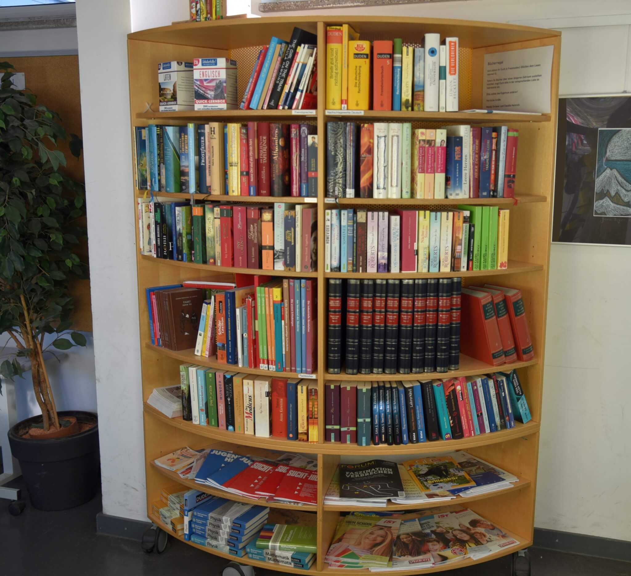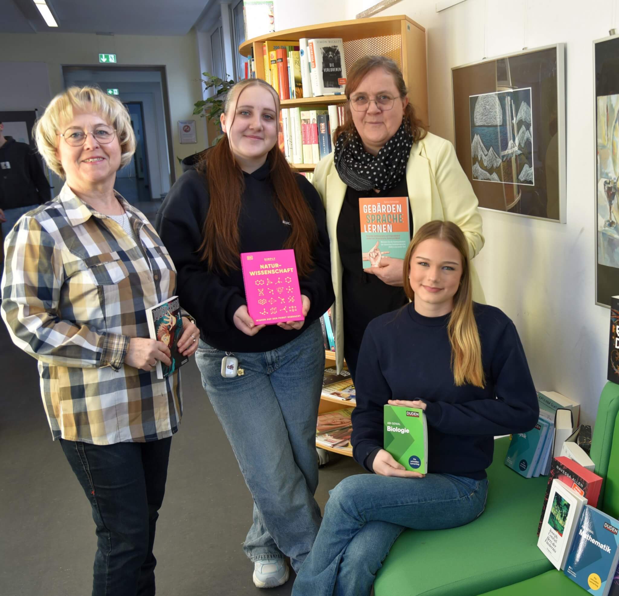 Seit Monaten kümmert sich Mitarbeiterin Mandy Strüwer um die stetig wachsende Sammlung von Büchern, Broschüren und Infomaterial, die in einer Lese-Ecke für alle Interessierten frei zugänglich ist. Die Mädchen und Jungen können die Bände im benachbarten Aufenthaltsraum lesen oder sogar nachhause mitnehmen. „An unserer Gesamtschule lernen über 600 Kinder und Jugendliche, seit diesem Schuljahr besuchen auch küftige Abiturienten die gymnasiale Oberstufe. Entgegen dem Vorurteil vieler Erwachsener ist das Interesse der Heranwachsenden an unseren Büchern sehr groß,“ berichtete Mandy Strüwer. „Wir freuen uns, dass wir heute neue Publikationen im Wert von 300 € übergeben können“, betonte Beate Kammer vom Vorstand des Fördervereins. „Das Geld haben unsere Vereinsmitglieder unter anderem bei Buchspendeaktionen in der Bibliothek und beim Weihnachtsmarkt gesammelt
