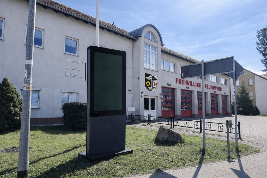 Vor dem Feuerwehrgerätehaus soll eine digitale, wetterfeste Informationstafel installiert werden. Sie informiert Bürgerinnen und Bürger über wichtige Themen rund um Sicherheit und das Leben im Ort.