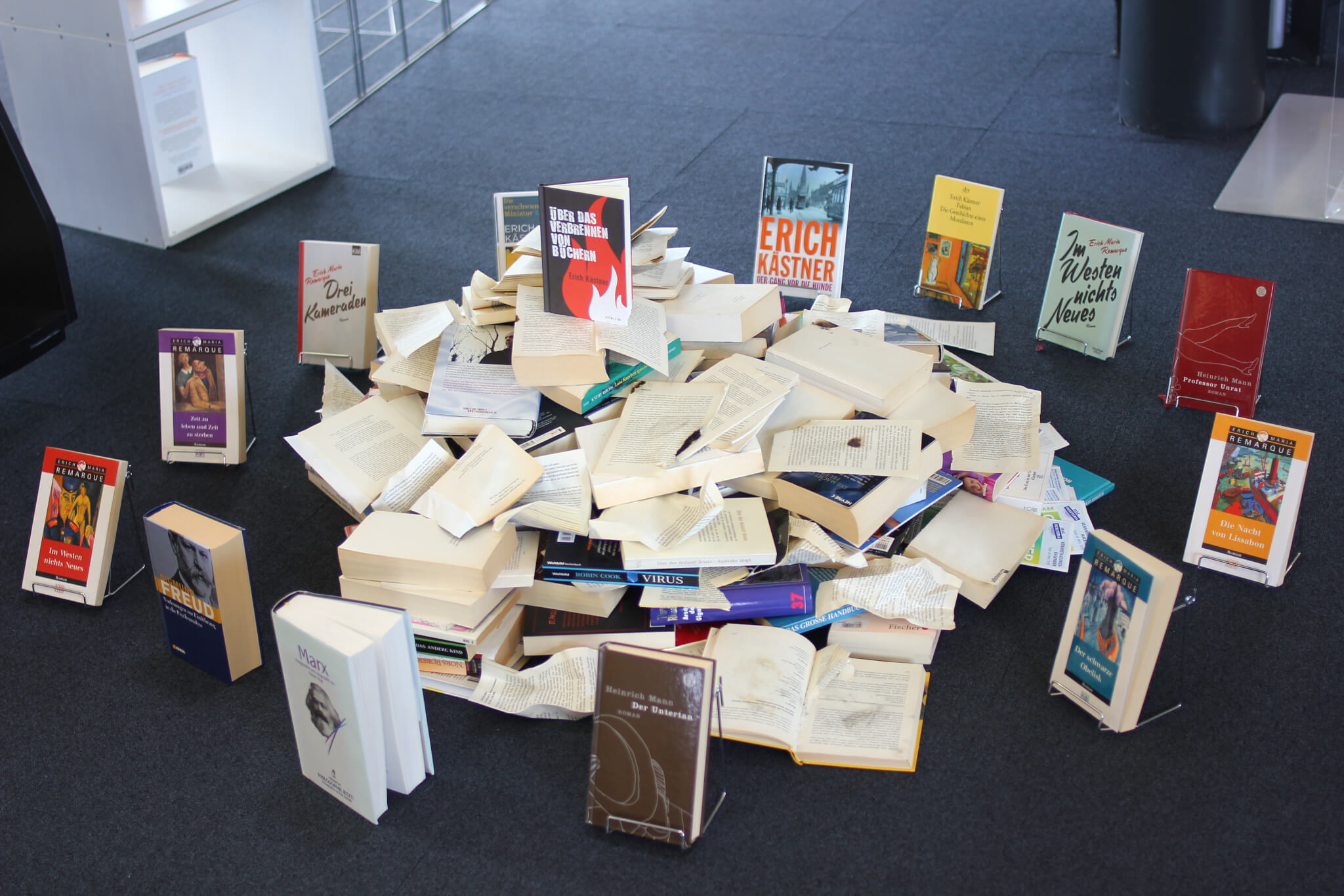 Die Stadtbibliothek Ludwigsfelde hat im Zentrum ihrer Räumlichkeiten einen symbolischen Bücherhaufen aufgebaut, der wiederum von Büchern umgeben ist, deren Autoren im Mai 1933 auf den „Schwarzen Listen“ standen und als zersetztes Schrifttum galten.