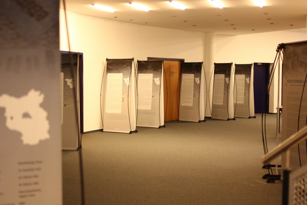 Parallel zu den geplanten Aktionen rund um die Bücherverbrennung können sich interessierte Bürgerinnen und Bürger vor den Sitzungssälen im Rathaus die Ausstellung [Kein schöner Land] – Todesopfer rechter Gewalt ansehen.