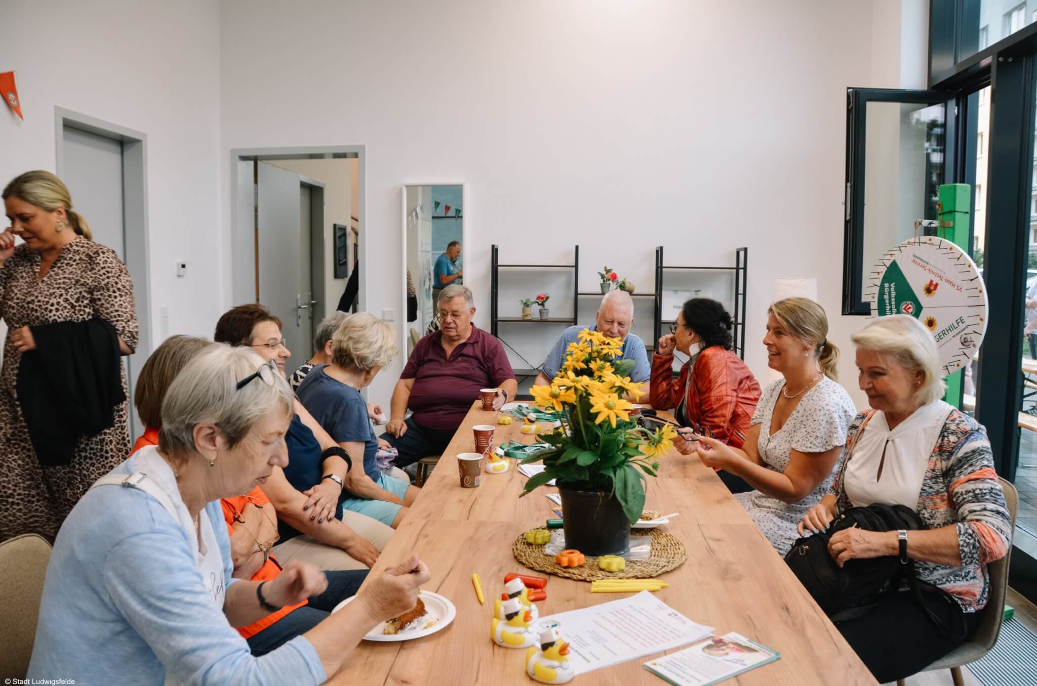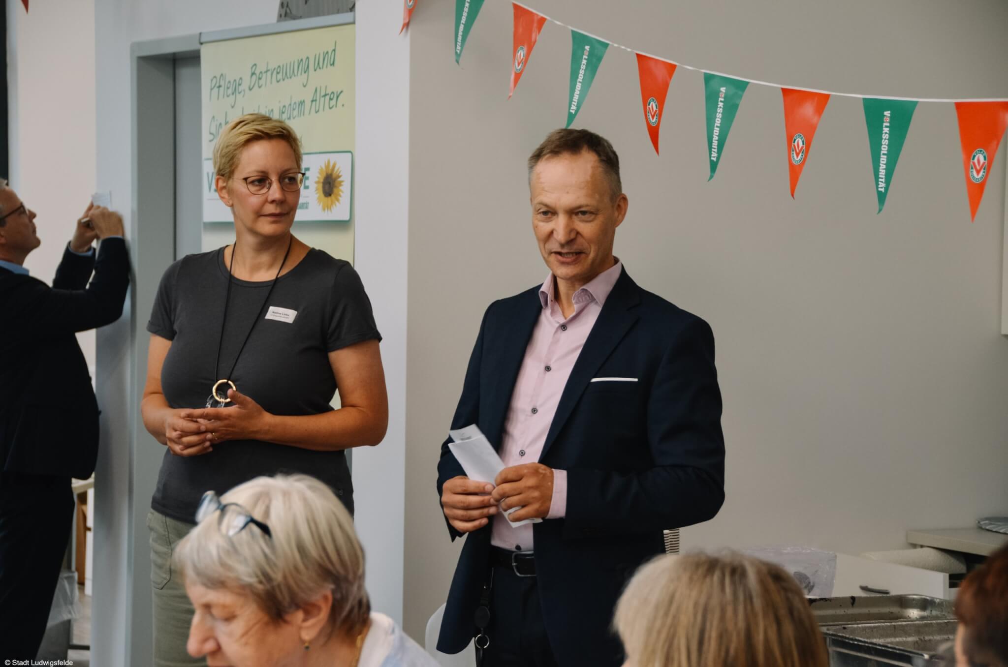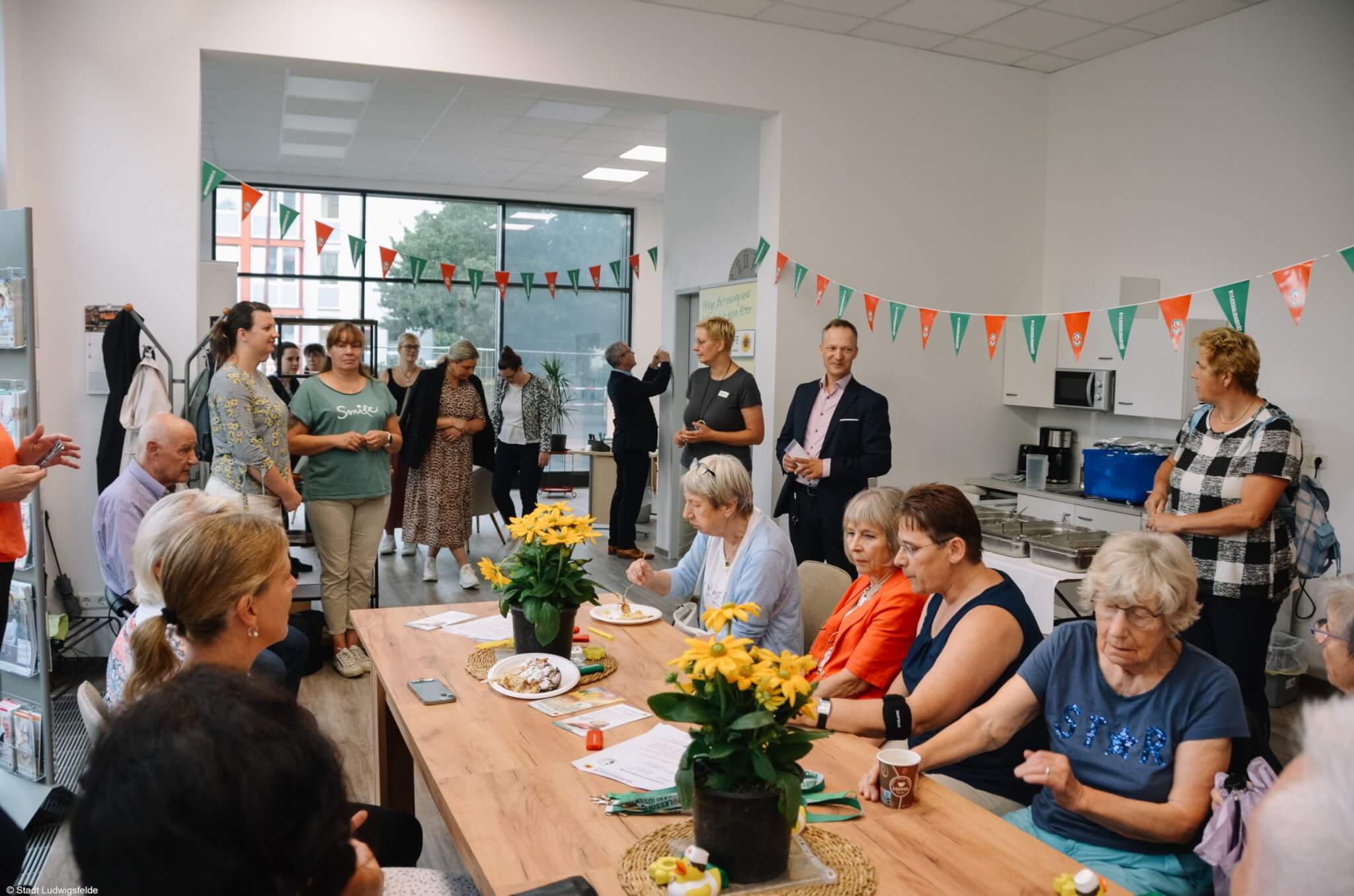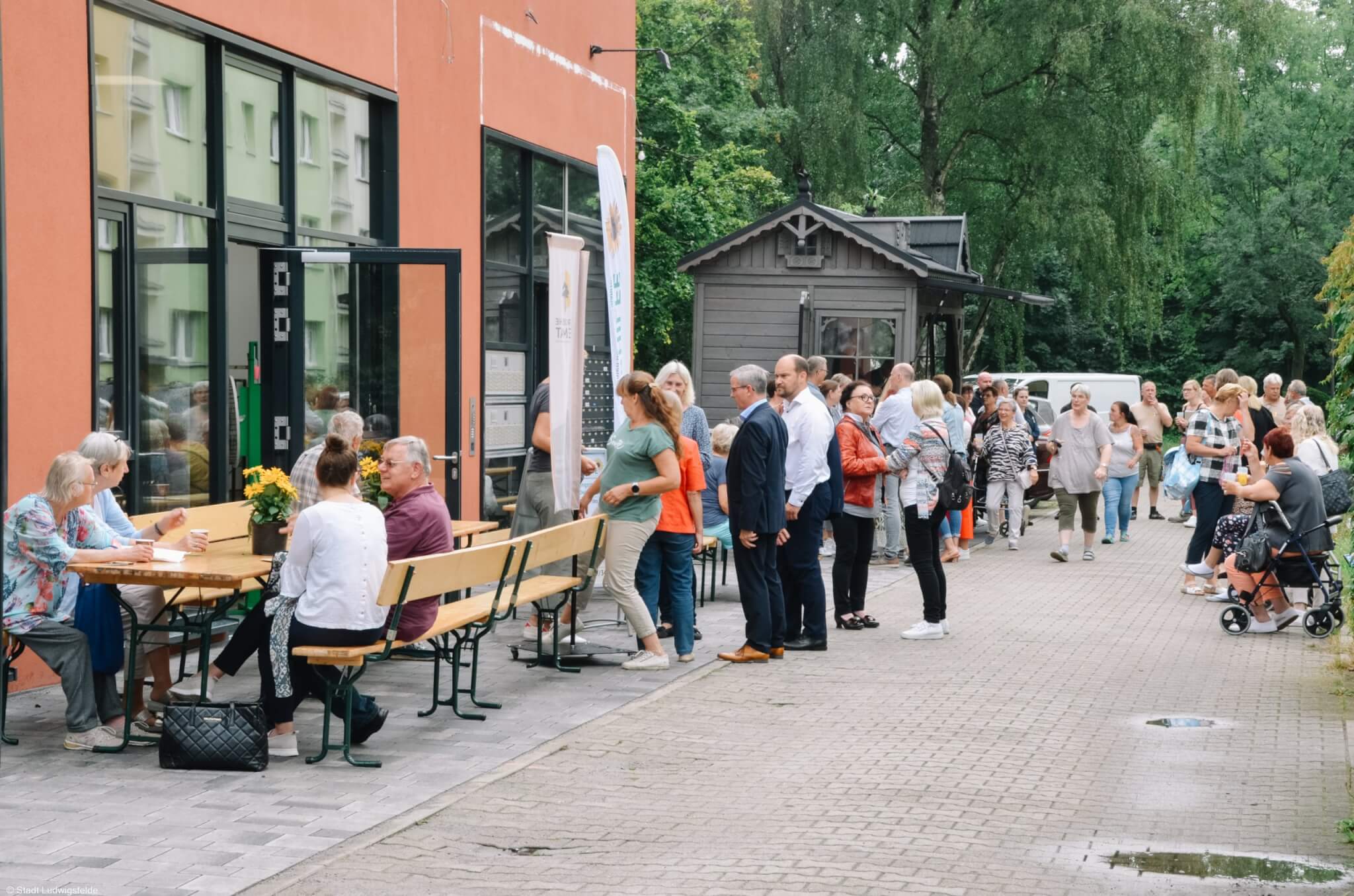 Frank Kerber, Geschäftsführer der Märkischen Heimat, erläuterte zur Eröffnung die Hintergründe des neuen Wohnkonzepts. Ausgangspunkt waren einige Bänke vor der Haustür des Mittelganghauses, die bei den Bewohnern sehr beliebt, aber stets hart „umkämpft“ waren. Die begrenzten Plätze, um mit anderen Bewohnern in Kontakt zu treten, waren bisher beschränkt. Mit dem neuen Anbau, der neben einem großen Gemeinschaftsraum und der Geschäftsstelle der VS Bürgerhilfe auch über eine großzügige Terrasse verfügt, soll das soziale Miteinander gestärkt und ein fester Treffpunkt etabliert werden, in dem Angebote und gemeinsame Aktivitäten stattfinden – auch um Vereinsamung im Alter entgegenzuwirken. Zwei Mitarbeiterinnen der VS Bürgerhilfe stehen den Bewohnern zudem ab sofort an drei Tagen in der Woche zur Verfügung, um Unterstützung zu bieten und Kontakte zu knüpfen.