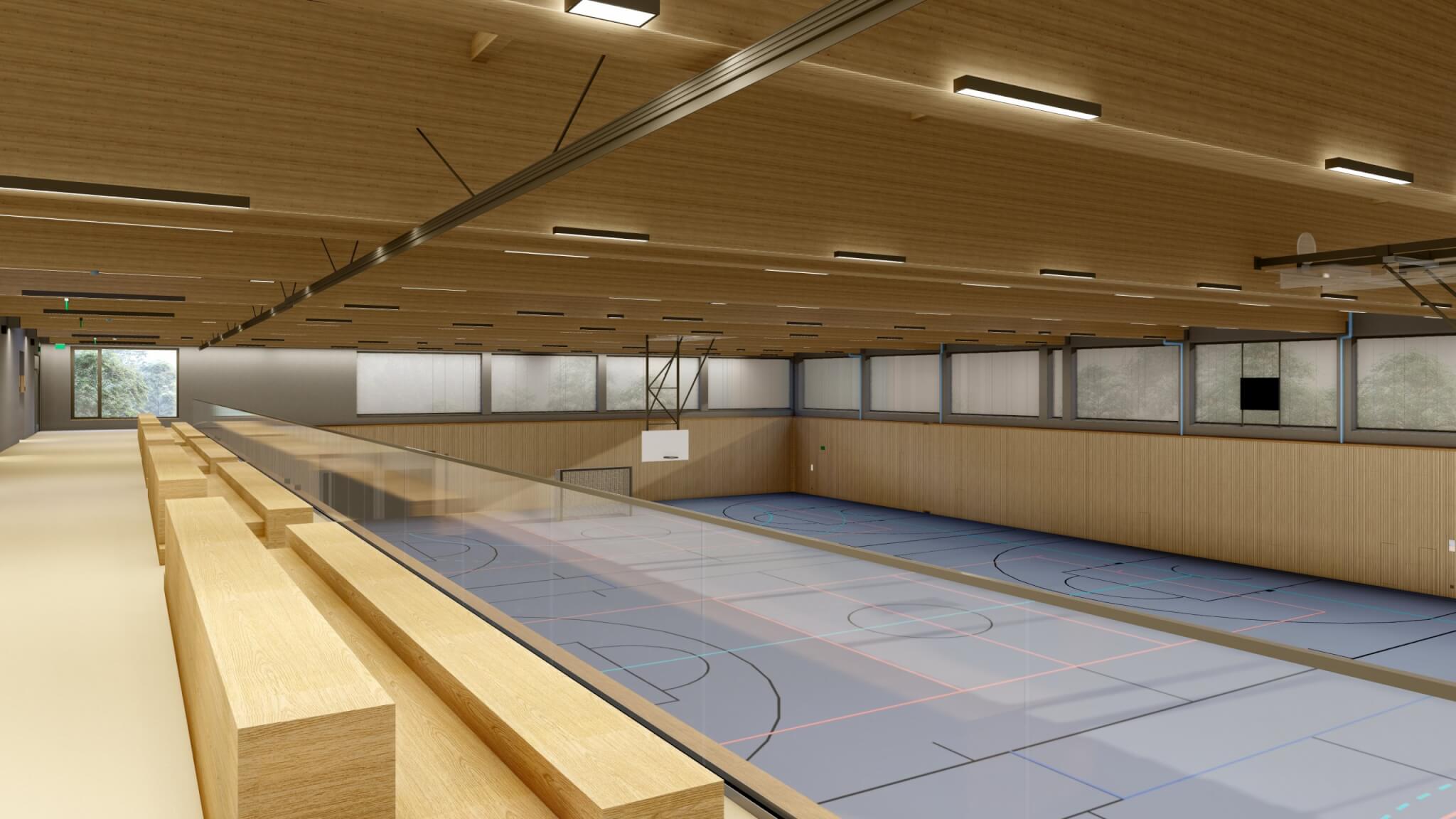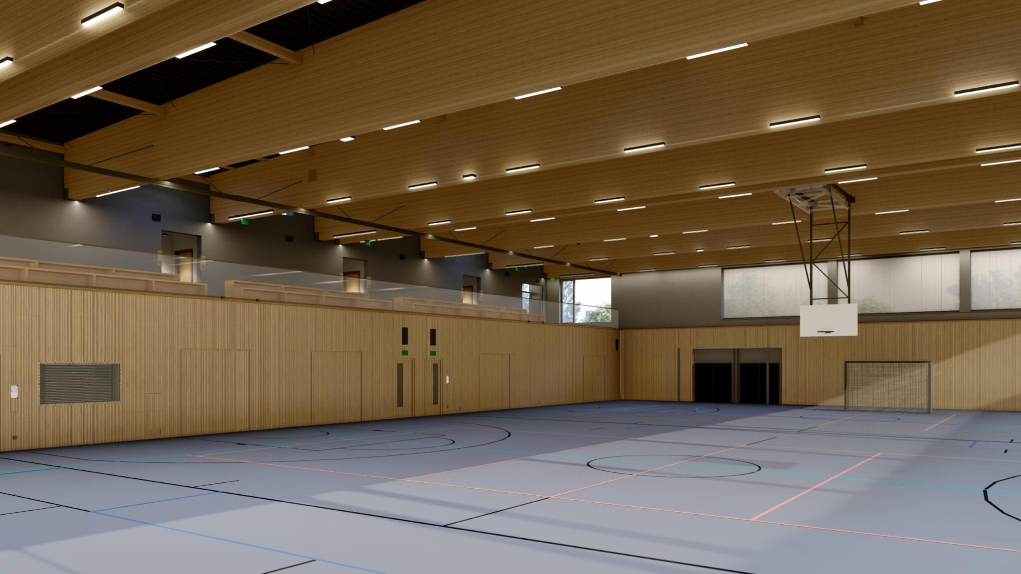 Mit einer Fläche von etwa 50 x 40 Metern bietet die Halle Raum für verschiedene Sportarten wie Basketball, Tischtennis und Fußball. 114 Tribünenplätze, großzügige Fensterfronten für natürliches Licht und ein modernes Belüftungssystem sorgen für eine angenehme Atmosphäre. Als Ersatz für gerodete Flächen werden rund 40 neue Bäume um die Halle gepflanzt.