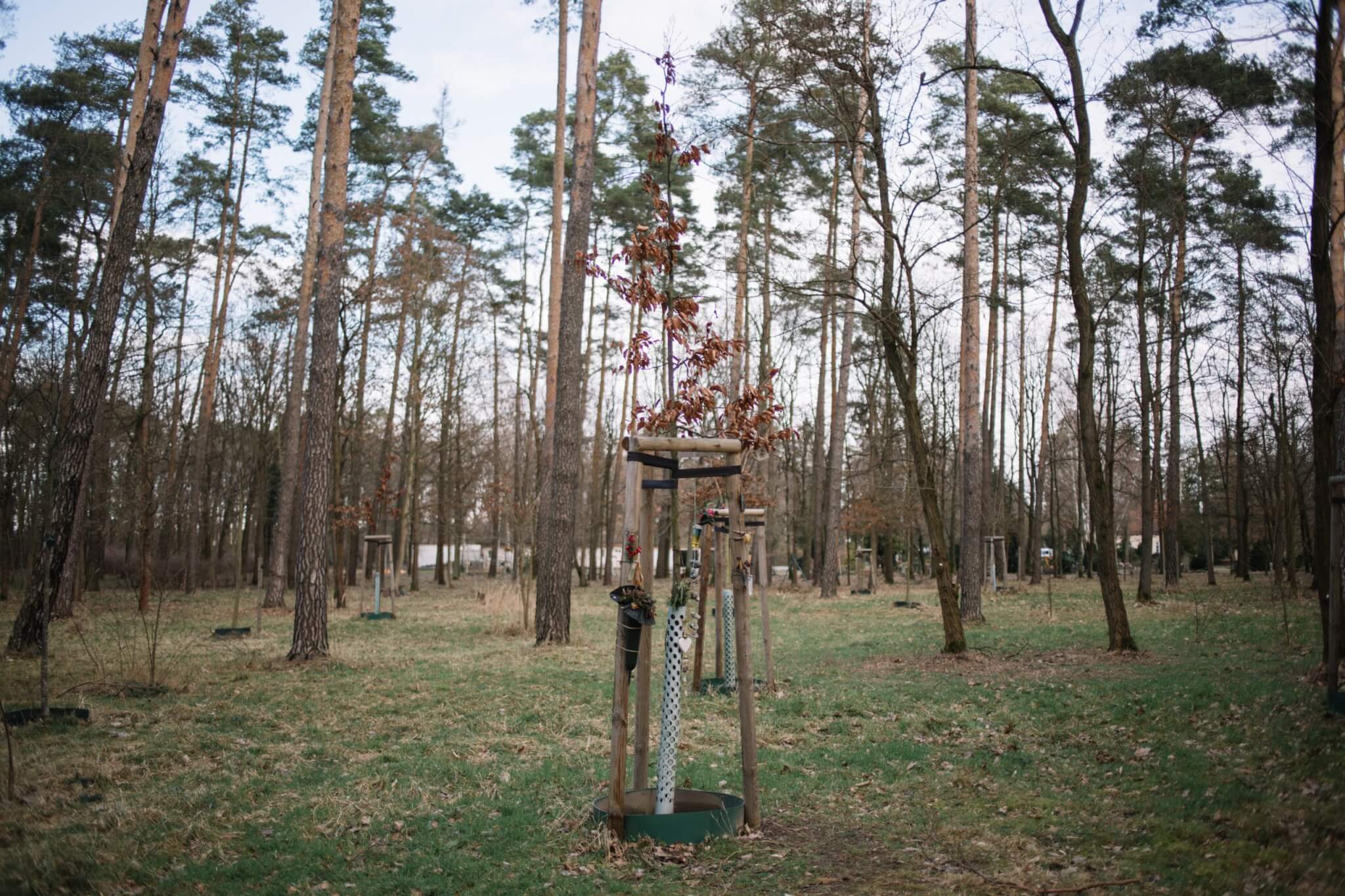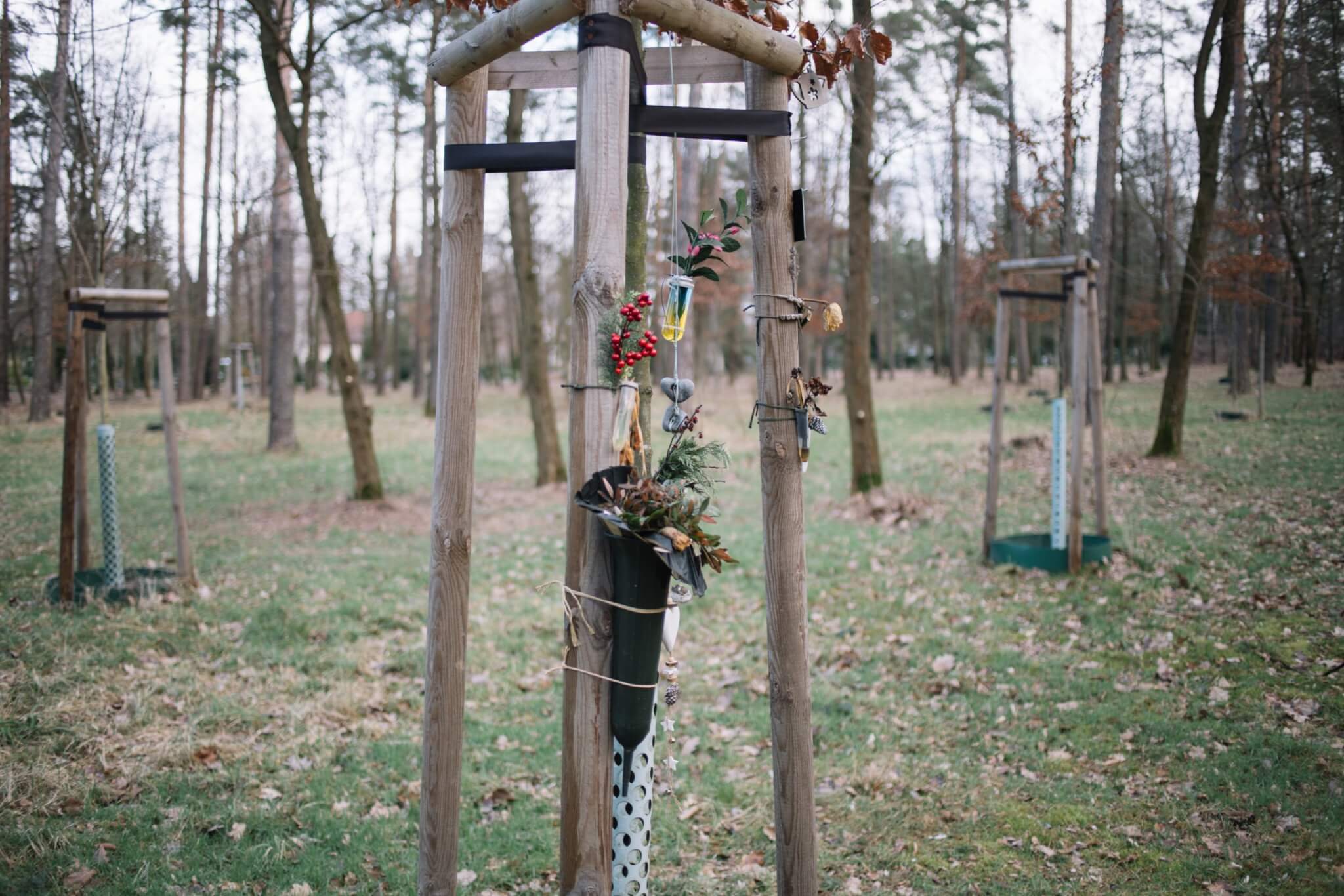 Gleichermaßen verhält es sich im angrenzenden Bestattungswald. Auch hier ist grundsätzlich kein Grabschmuck erlaubt! Der Charakter des Waldes soll bei dieser Bestattungsart zwingend erhalten bleiben. Ein Grund dafür ist unter anderem die freie Zugänglichkeit des Waldes für Mensch und Tier. Vor allem letzteres wird durch bestimmten Grabschmuck (z. B. Nahrung) angezogen.