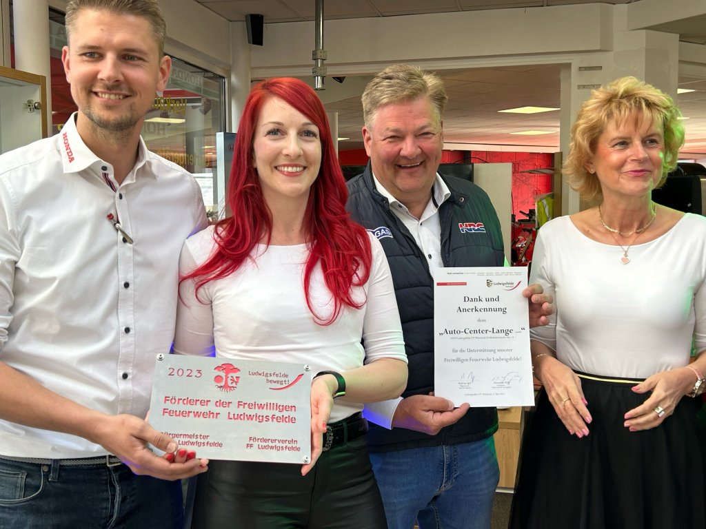 Dank und Anerkennung erhielt Familie Lange für die großzügige Unterstützung der Freiwilligen Feuerwehr Ludwigsfelde. Matthias Richter (FFW) und Guido Sachs (Förderverein FFW) überreichten zusammen mit Bürgermeister Andreas Igel diese erstmalige Auszeichnung in Form einer von den Elsterwerken gestalteten Tafel.
