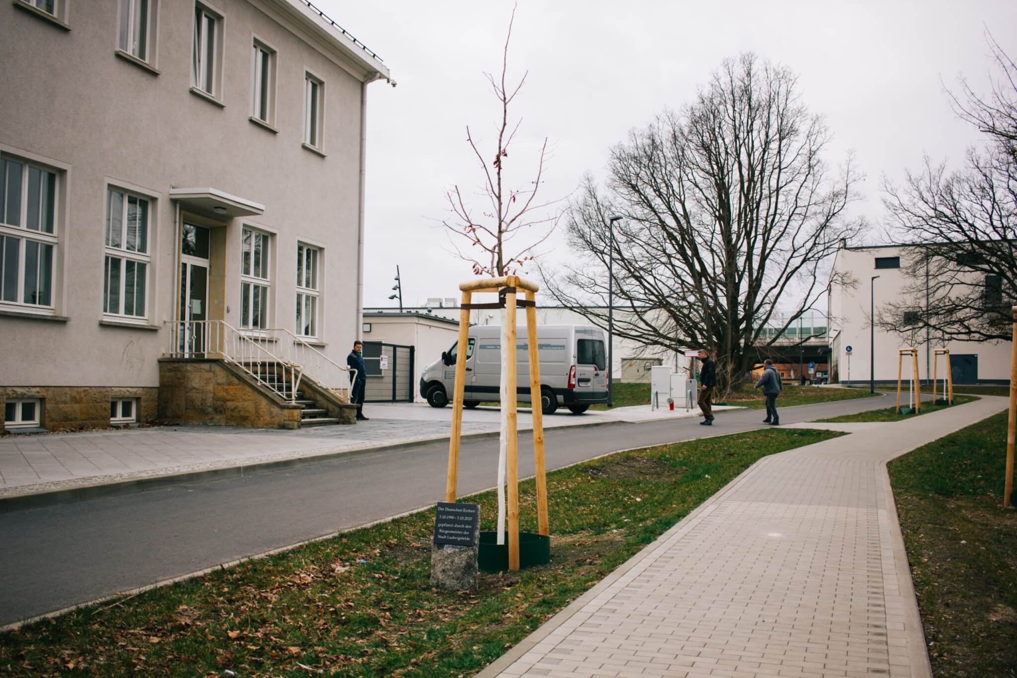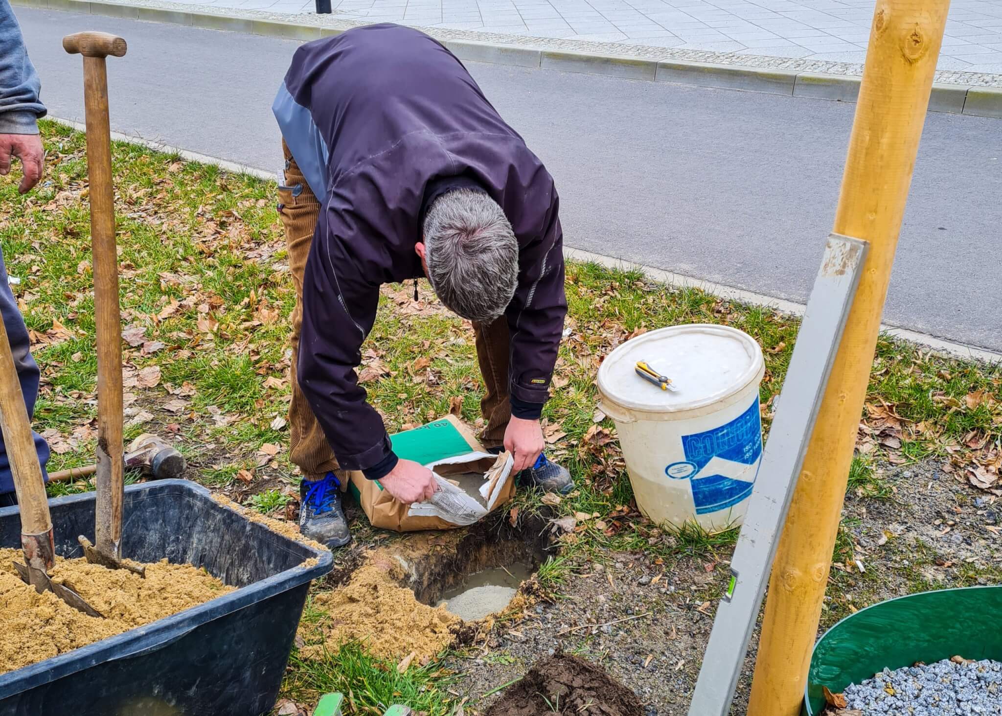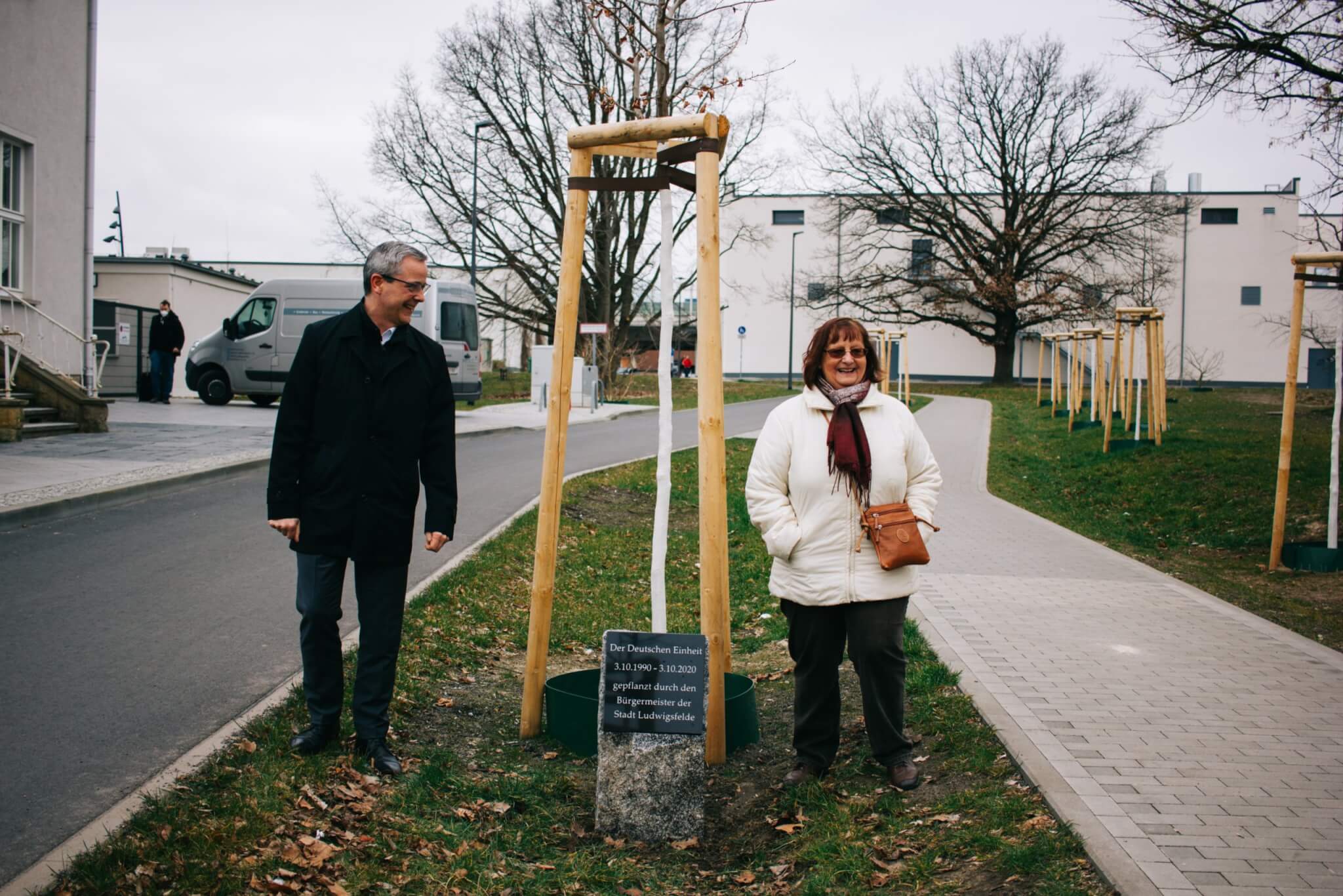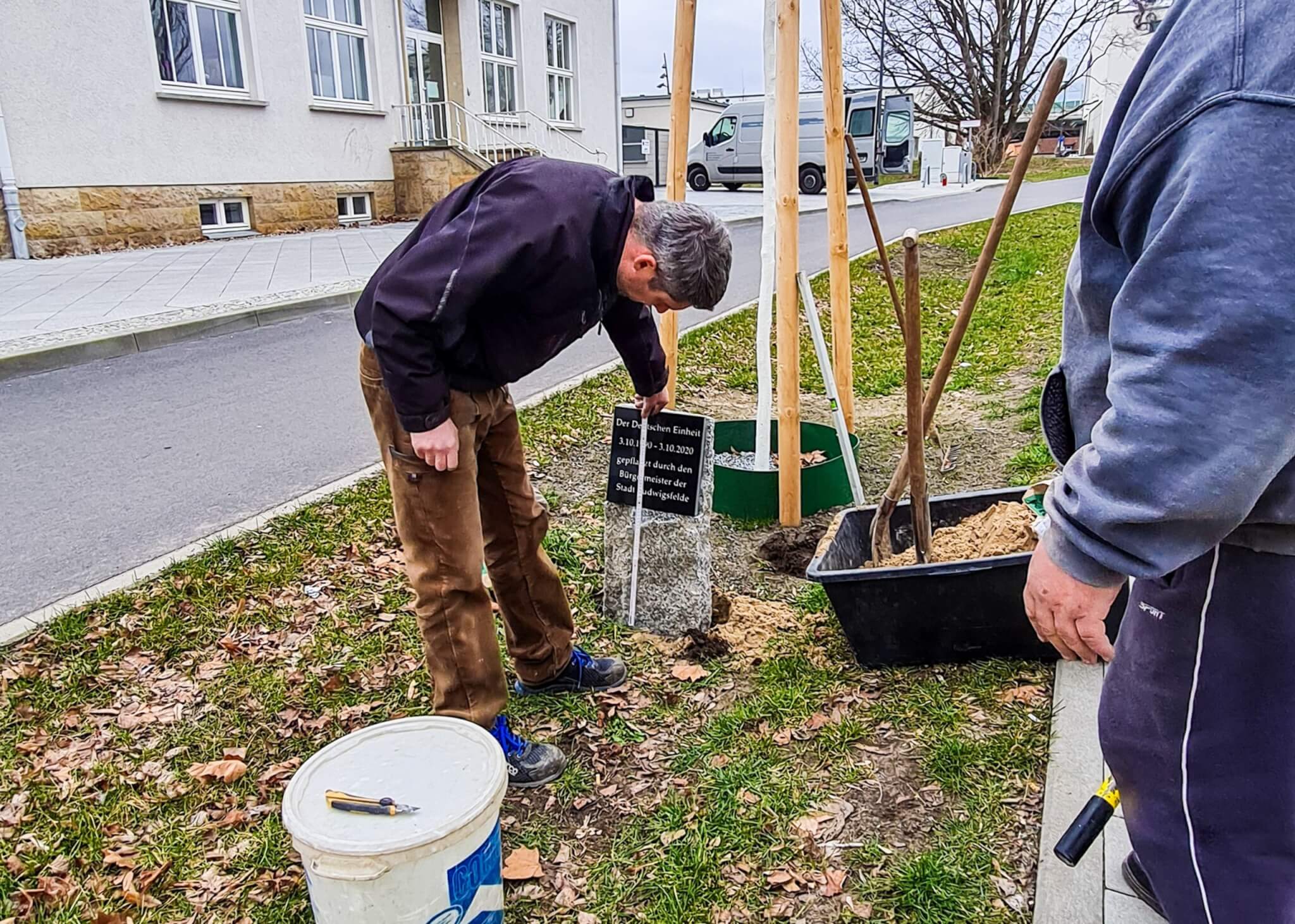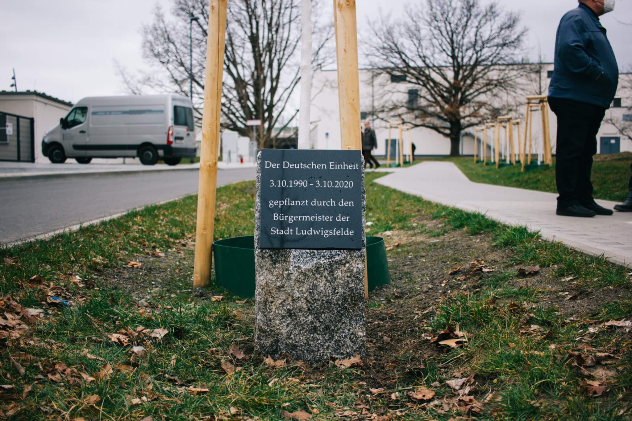 In Zusammenarbeit mit Steinmetz Matthias Klotz wurde am Dienstag ein Erinnerungsstein vor den „Einheitsbaum“ an der Fahrradstraße am Klubhaus gesetzt. Der Eisenholzbaum wurde im vergangenen Jahr, am Tag der Deutschen Einheit, im Zuge der bundesweiten Aktion „Einheitsbuddeln“ durch Bürgermeister Andreas Igel gepflanzt. Die Idee zu diesem Stein kam von der Ludwigsfelderin Silvia Zahn, die die Pflanzaktion im vergangenen Oktober begleitete.