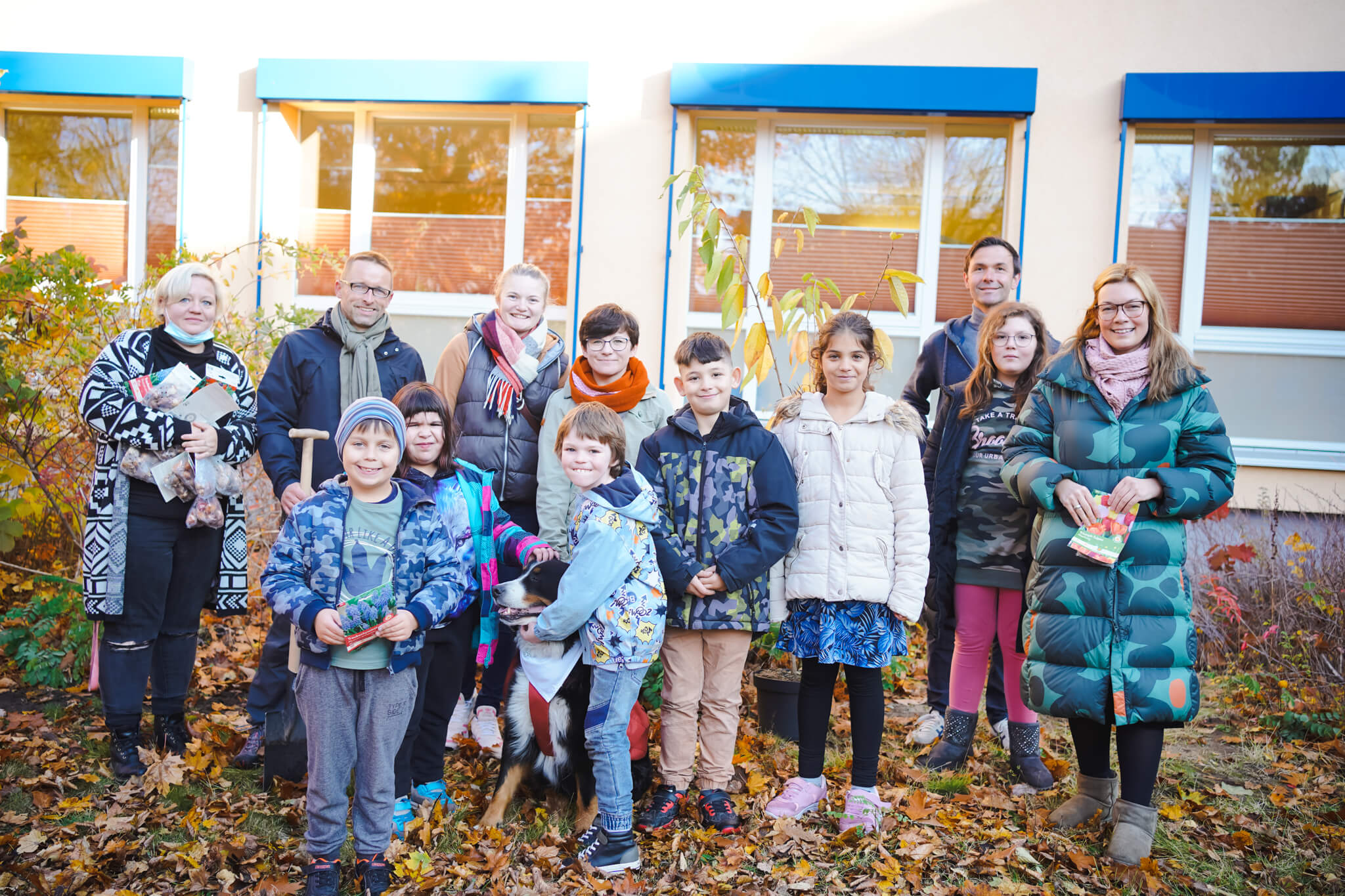Die Mitglieder des Vereins Grünstreifen Ludwigsfelde e.V. haben am Donnerstag einen Knorpelkirschbaum an die Schülerinnen und Schüler der Mosaik-Schule übergeben. Anlass war die Umbenennung der Schule. Neben dem Baum brachten die Vereinsmitglieder auch Blumenzwiebeln mit, die sie bei bestem Wetter gemeinsam mit den Schülerinnen und Schülern auf dem Schulhof eingepflanzt haben.