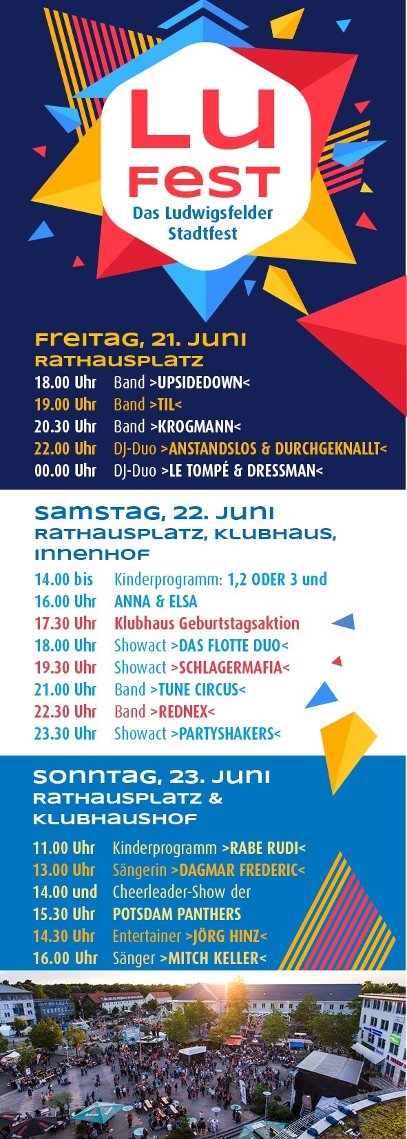Auch in diesem Jahr wird der Rathausplatz an zwei Tagen zum Spielort des Ludwigsfelder Stadtfestes. Vom 21.06. bis 23.06. wird für fast jeden Geschmack und jedes Alter etwas geboten.