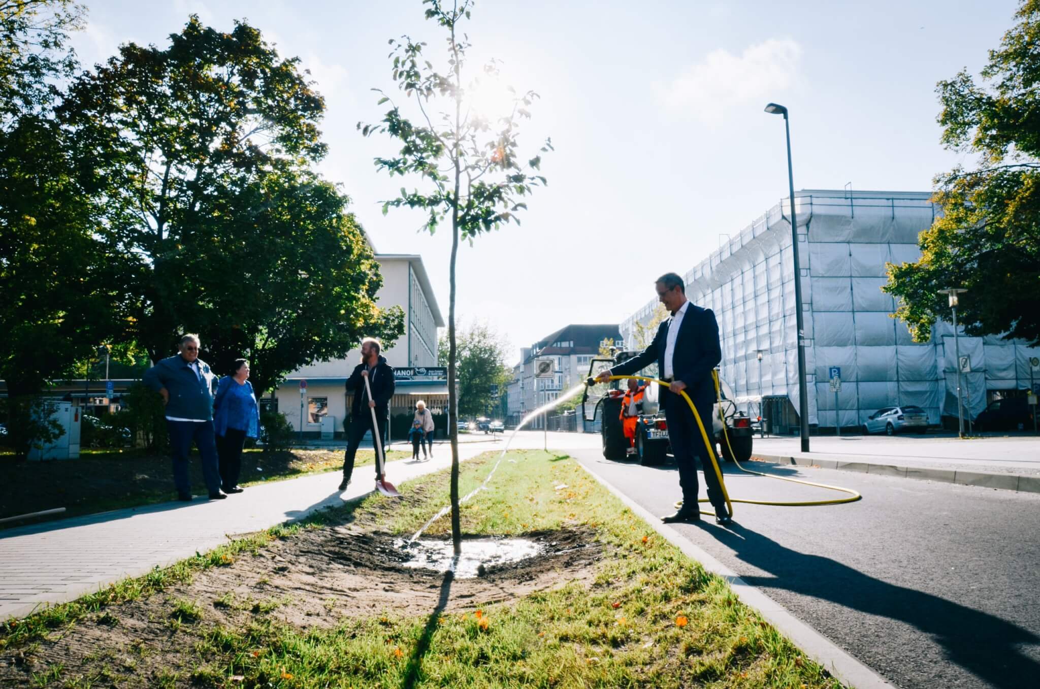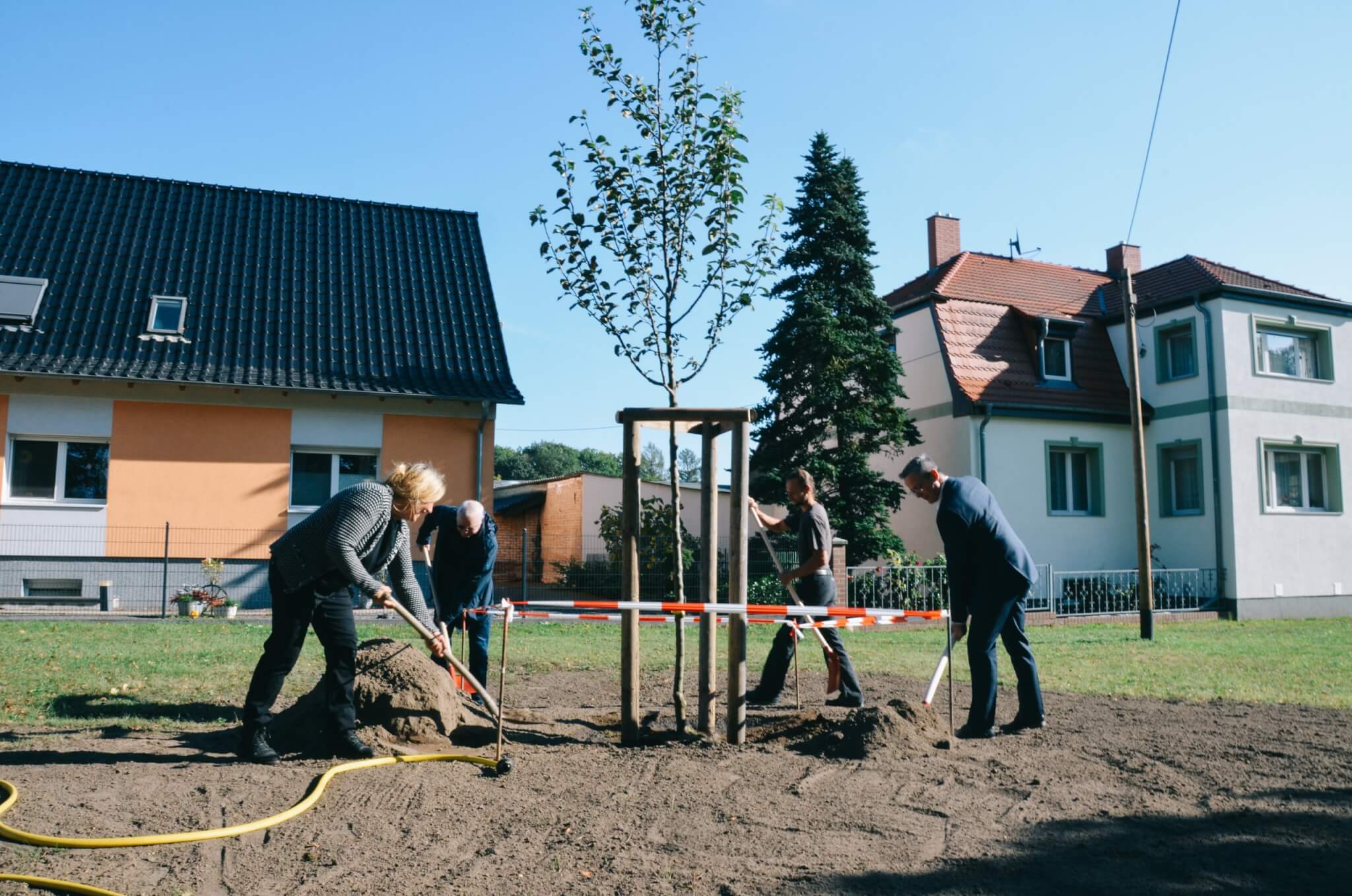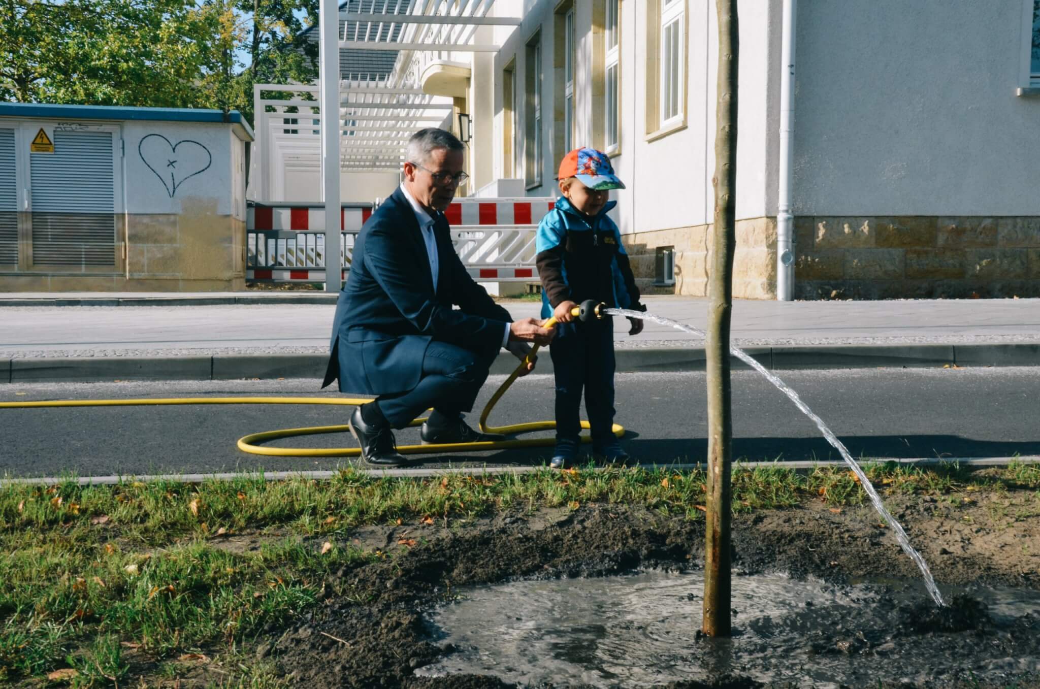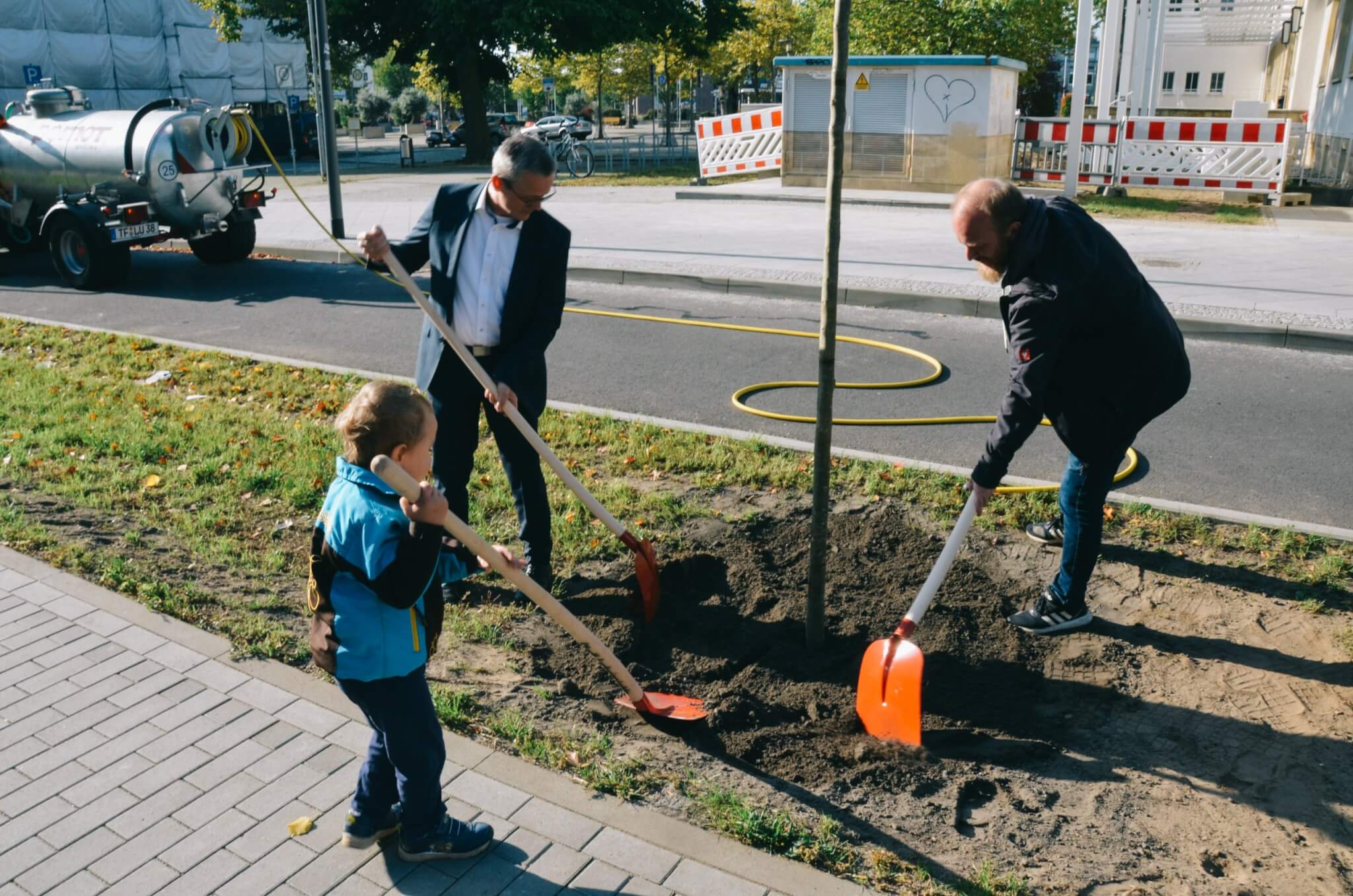 Am vergangenen Samstag, dem Tag der Deutschen Einheit, pflanzte Bürgermeister Andreas Igel im Sinne der Aktion „Einheitsbuddeln“ nun symbolisch den ersten von insgesamt 13 Eisenholzbäumen an der Fahrradstraße. Zusammen mit dem dreijährigen Leon, der mit seiner Oma, der Stadtverordneten Angelika Wodtke, vor Ort war, und André Landwehr, Niederlassungsleiter der alpina AG, wurde der neugepflanzte Baum zunächst mit Erde bedeckt und anschließend angegossen. Die noch fehlenden Bäume und Büsche sollen dann in den kommenden Wochen gepflanzt werden, wenn die offizielle Pflanzzeit beginnt.