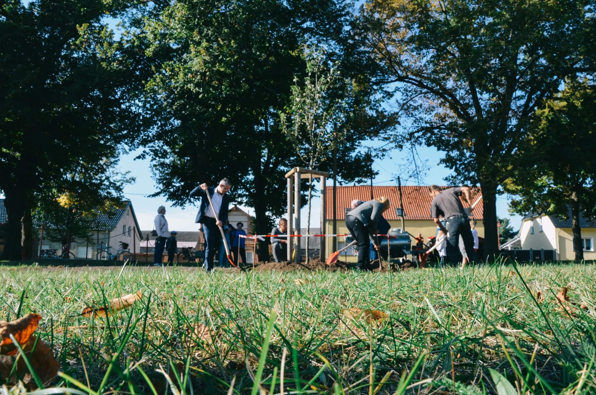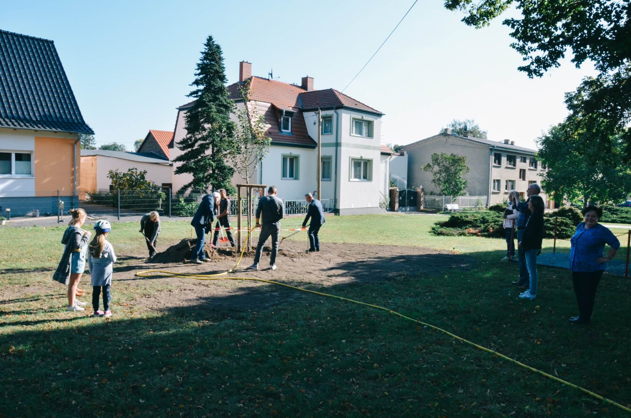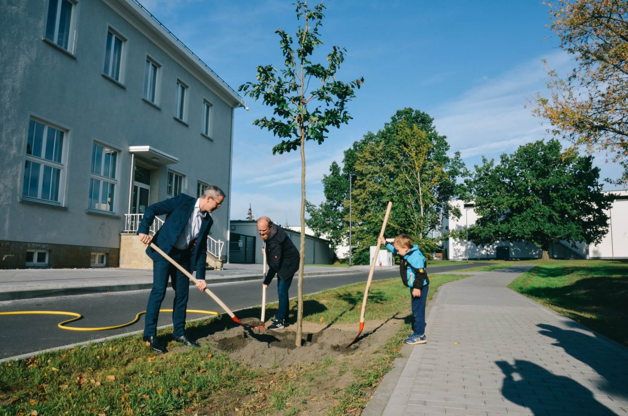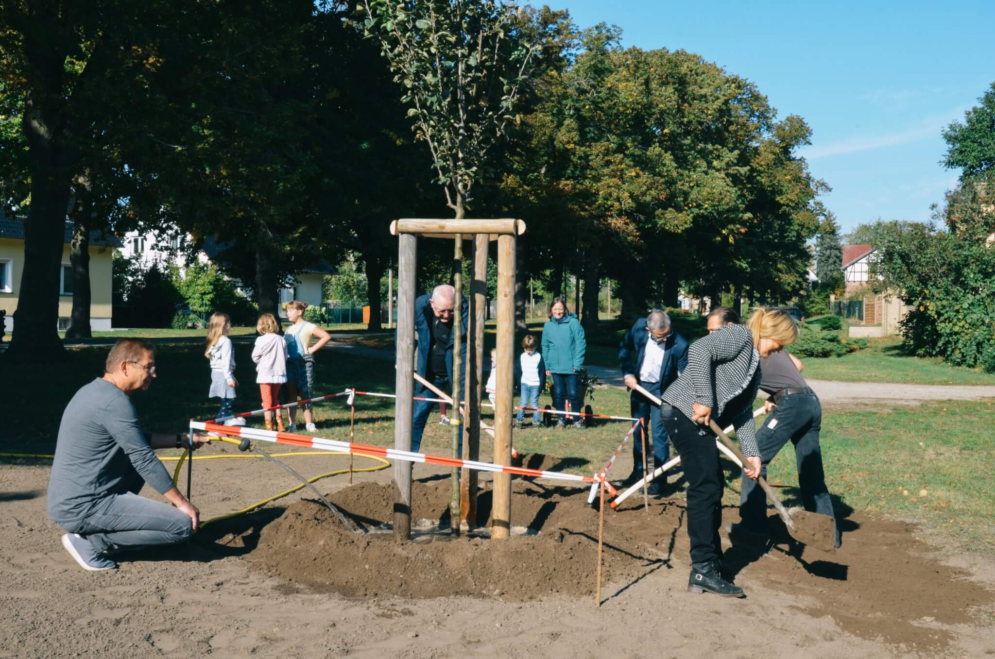 Am vergangenen Samstag, dem Tag der Deutschen Einheit, pflanzte Bürgermeister Andreas Igel im Sinne der Aktion „Einheitsbuddeln“ nun symbolisch den ersten von insgesamt 13 Eisenholzbäumen an der Fahrradstraße. Zusammen mit dem dreijährigen Leon, der mit seiner Oma, der Stadtverordneten Angelika Wodtke, vor Ort war, und André Landwehr, Niederlassungsleiter der alpina AG, wurde der neugepflanzte Baum zunächst mit Erde bedeckt und anschließend angegossen. Die noch fehlenden Bäume und Büsche sollen dann in den kommenden Wochen gepflanzt werden, wenn die offizielle Pflanzzeit beginnt.
