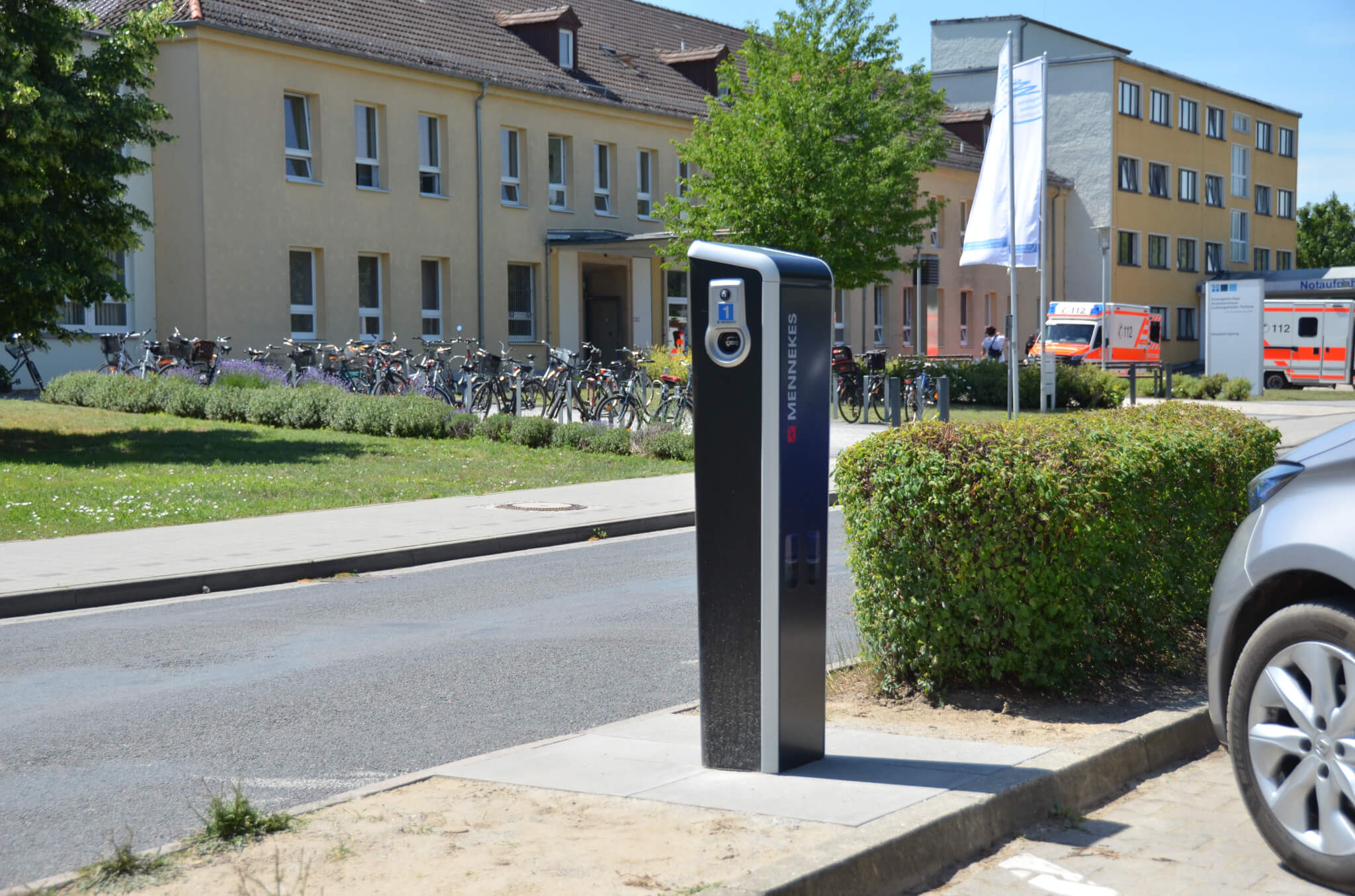 Auf dem Parkplatz am Krankenhaus können nun auch Elektroautos aufgeladen werden. Die entsprechende Ladesäule ist am Donnerstagvormittag in Betrieb gegangen. Das Parken der Autos ist für die Nutzer in diesem Zeitraum kostenfrei, sie zahlen für die Stunden, die sie ihr Auto aufladen. Es kann mit EC, Kredit oder Bargeld bezahlt werden. Auch das relativ neue Bezahlen via NFC ist am Krankenhaus möglich.