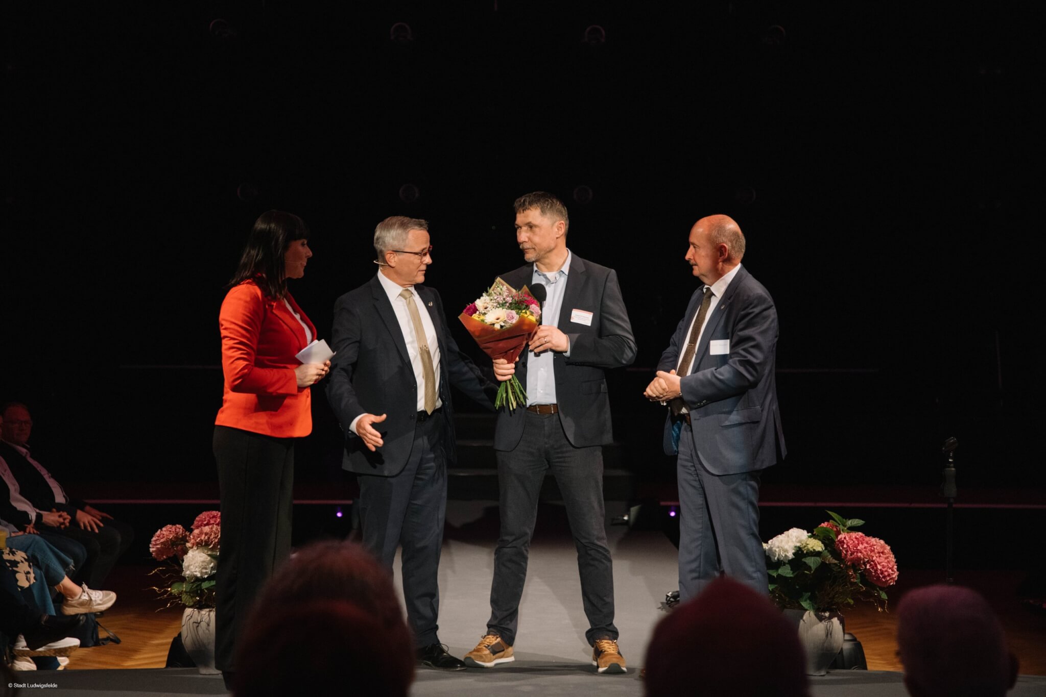 Sichtlich überrascht wurde Siegmund Swoboda von Bürgermeister Igel auf die Bühne gebeten. Der Geschäftsführer des Ludwigsfelder Unternehmens Arimex Plattenwärmetauscher-Service GmbH wurde noch einmal für den Gewinn des Wirtschaftspreises Teltow-Fläming in der Kategorie Industrie und Gewerbe gewürdigt. Das Familienunternehmen hatte die Auszeichnung im vergangenen Jahr erhalten und wurde dafür im Saal des Klubhauses noch einmal mit großem Applaus gefeiert.