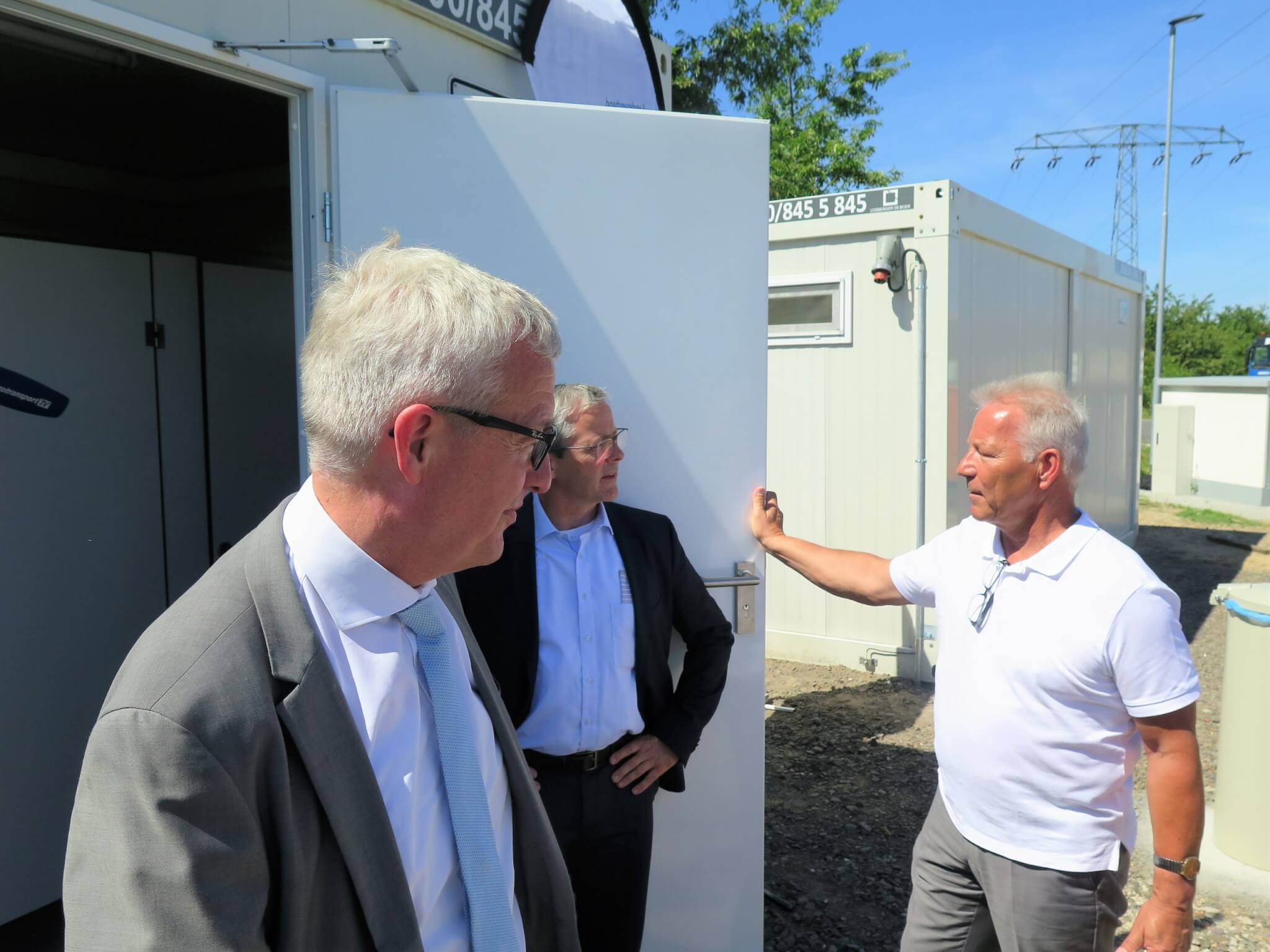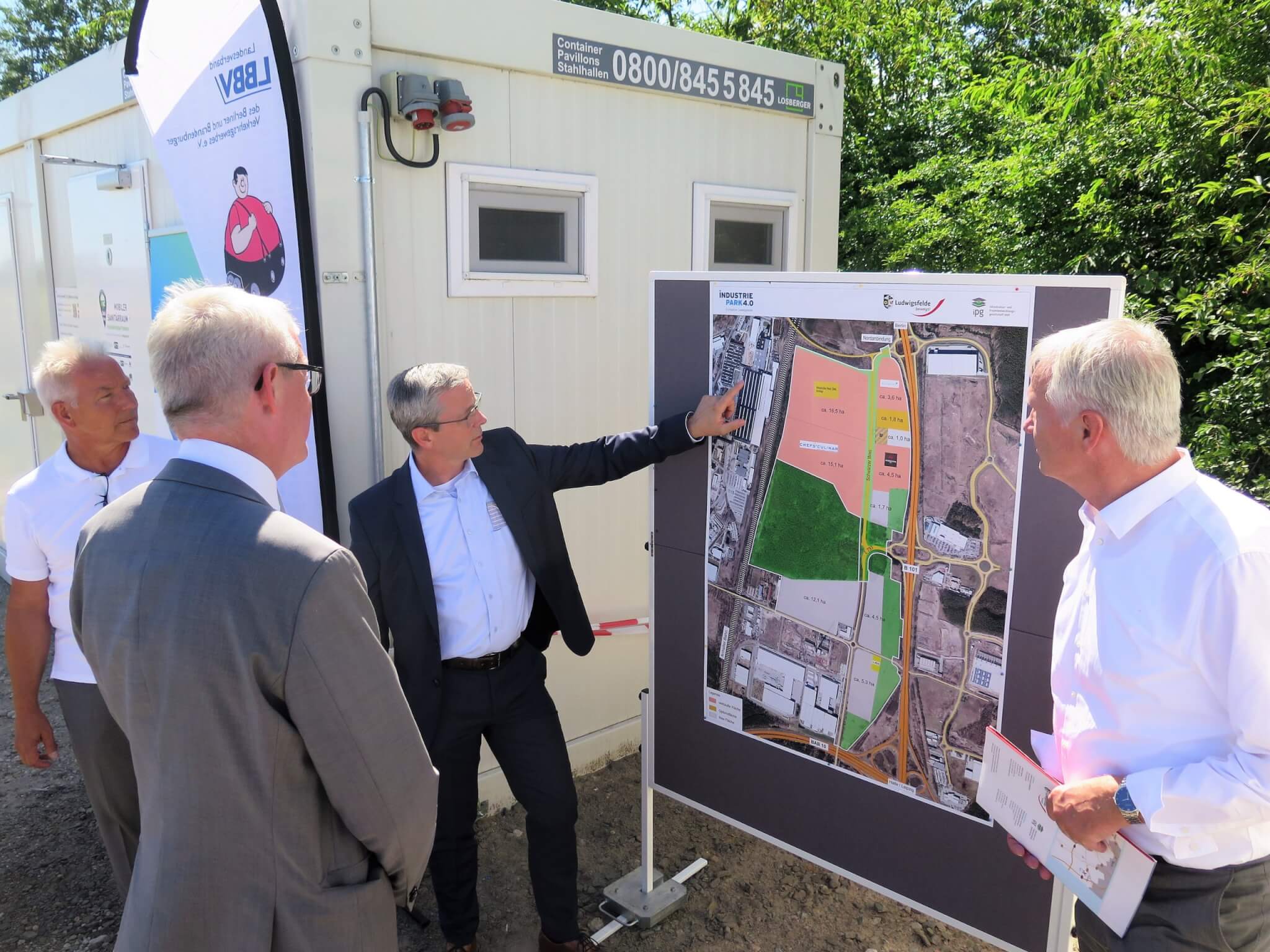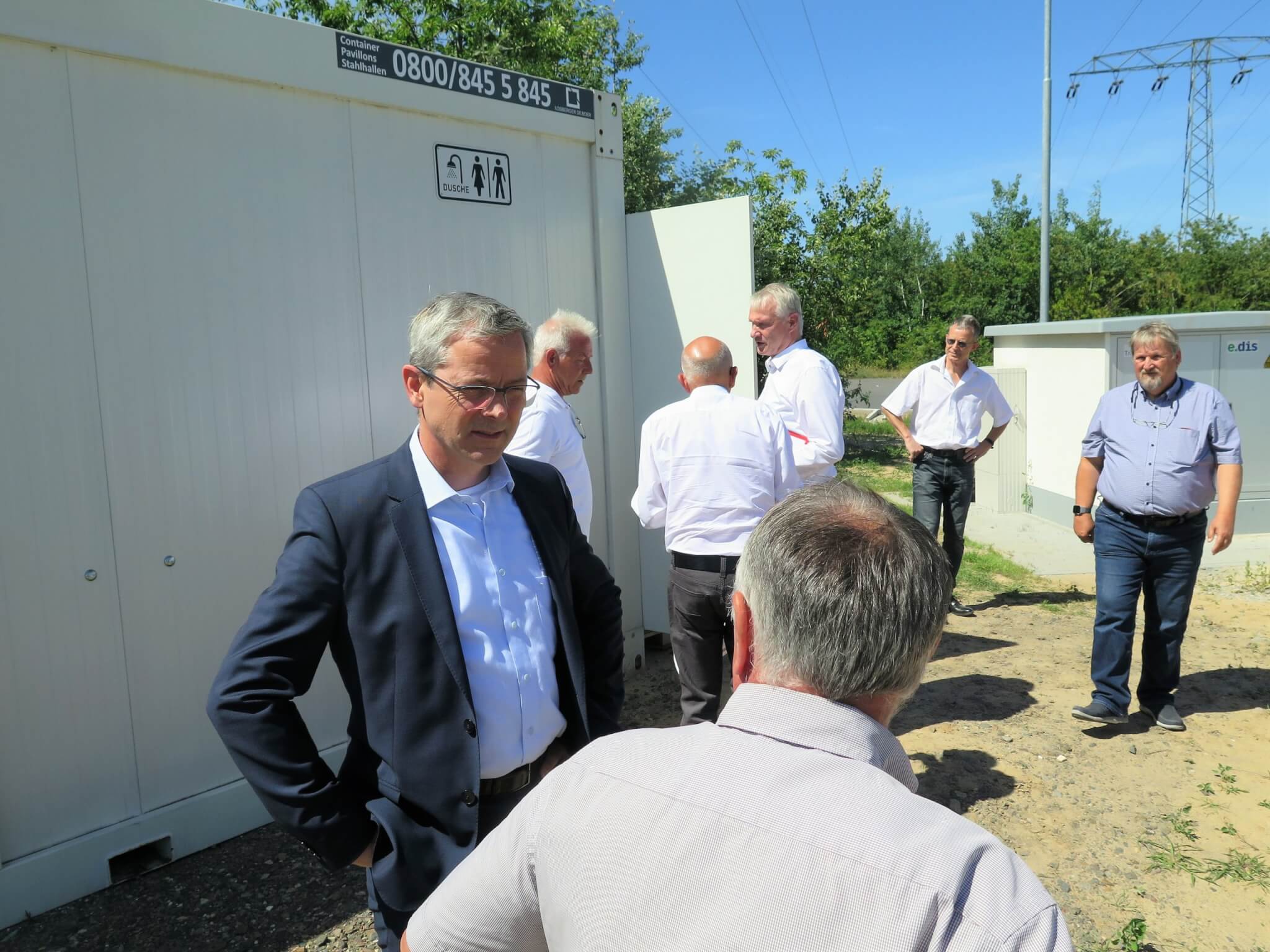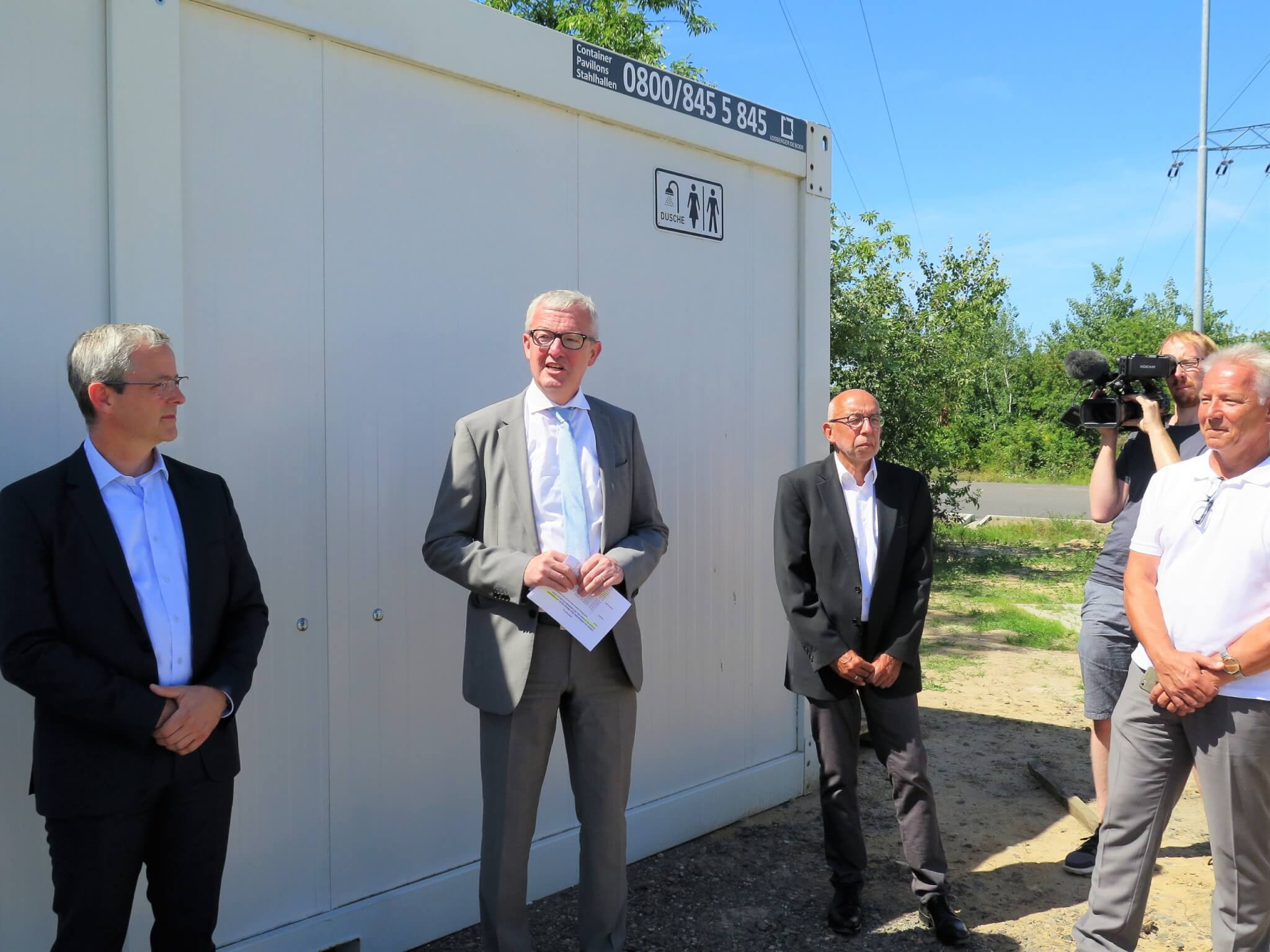 Stolz begutachtete Brandenburgs Verkehrsminister Guido Beermann am vergangenen Freitag die neuen Sanitärcontainer mit Duschen und Toiletten auf dem LKW Parkplatz im Industriegebiet 4.0 Eichspitze. Auch Bürgermeister Andreas Igel war trotz Urlaub vor Ort, um sich, zusammen mit Wirtschaftsförderer Wilfried Thielicke, ein Bild der Örtlichkeiten in direkter Nähe der B101 und Autobahn A10 zu machen.