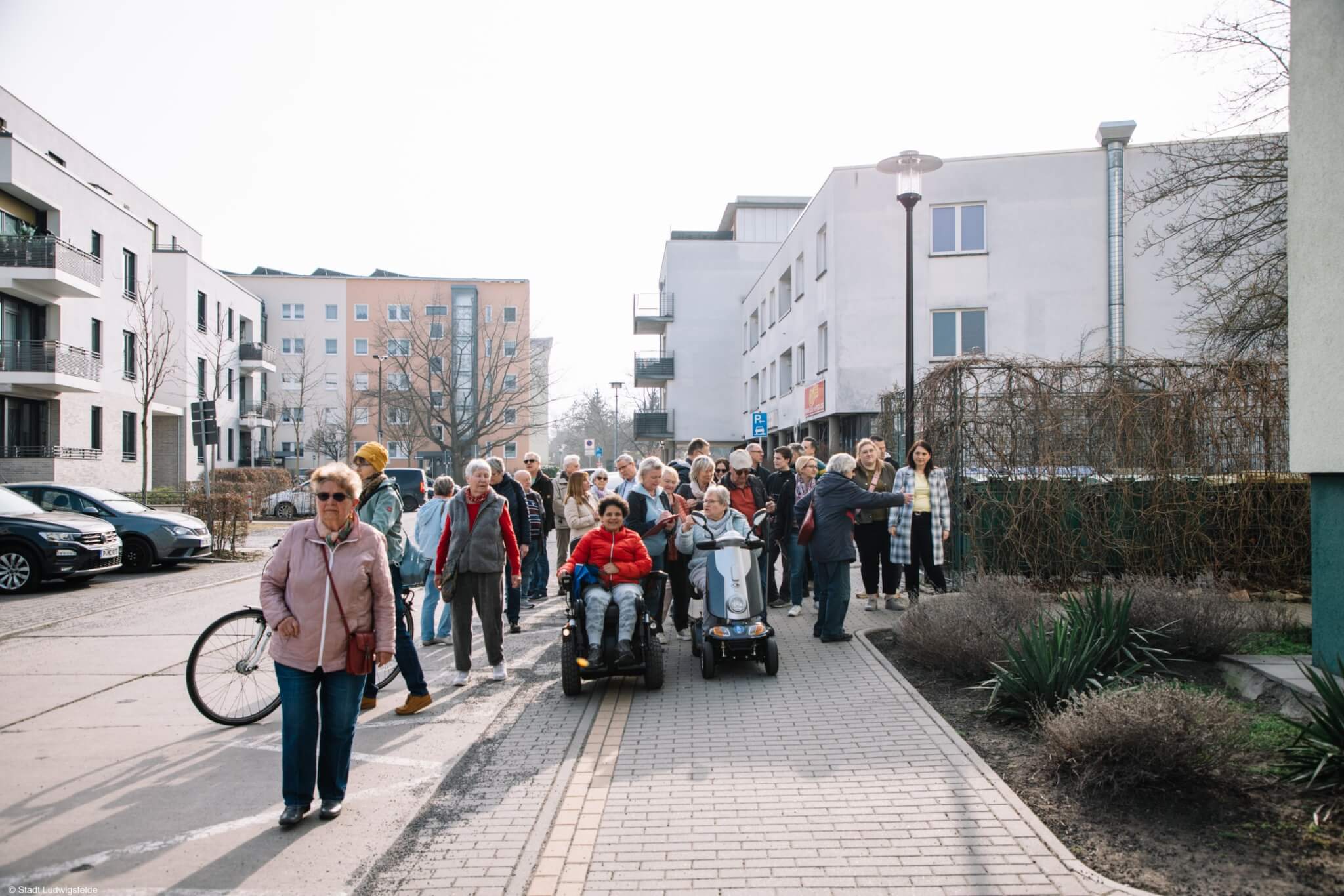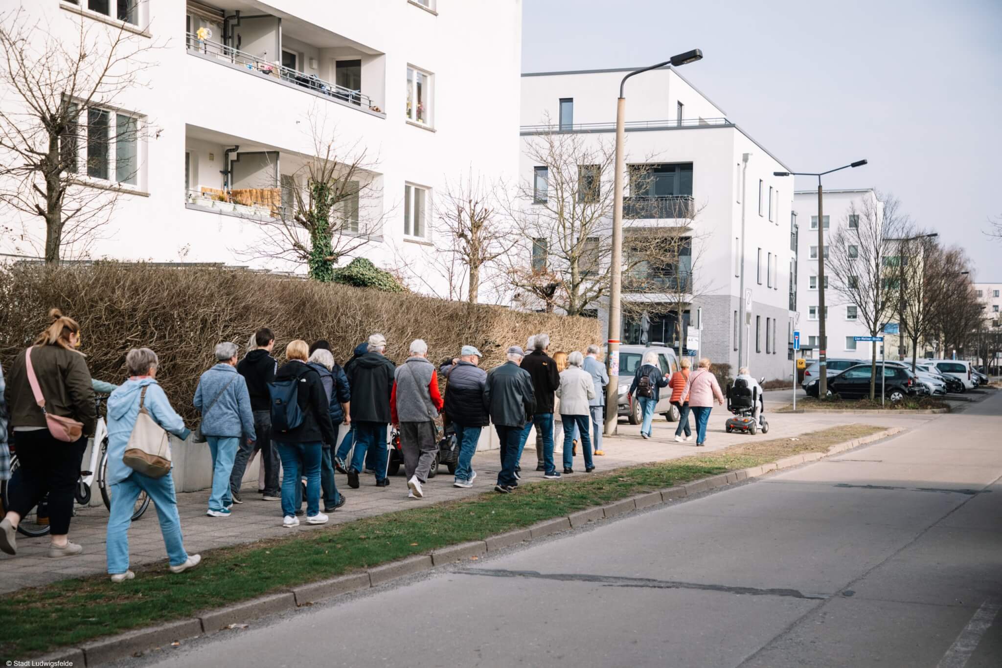 Beim gemeinsamen Stadtspaziergang des Seniorenbeirats Ludwigsfelde mit Bürgermeister Andreas Igel, Geschäftsführer Frank Kerber von der Märkischen Heimat, Henry Suczawski, Technischer Vorstand der LWG sowie etlichen Mitarbeiterinnen und Mitarbeitern aus dem Rathaus (danke dafür, dass Sie sich die Zeit genommen haben!) nutzten über 40 interessierte Bürgerinnen und Bürger dir Gelegenheit zum direkten Austausch. Vor Ort, in LuWest (Donaustraße | Lise-Meitner-Straße | Clara-Zetkin-Straße | August-Bebel-Straße) wurden aktuelle Themen angesprochen, Anliegen diskutiert und mögliche Umsetzungen erörtert. Der Spaziergang bot eine gute Möglichkeit, sich gemeinsam ein Bild von verschiedenen Straßenzügen in LuWest zu machen und miteinander ins Gespräch zu kommen. Viele Teilnehmer begrüßten das offene Format und den persönlichen Dialog.