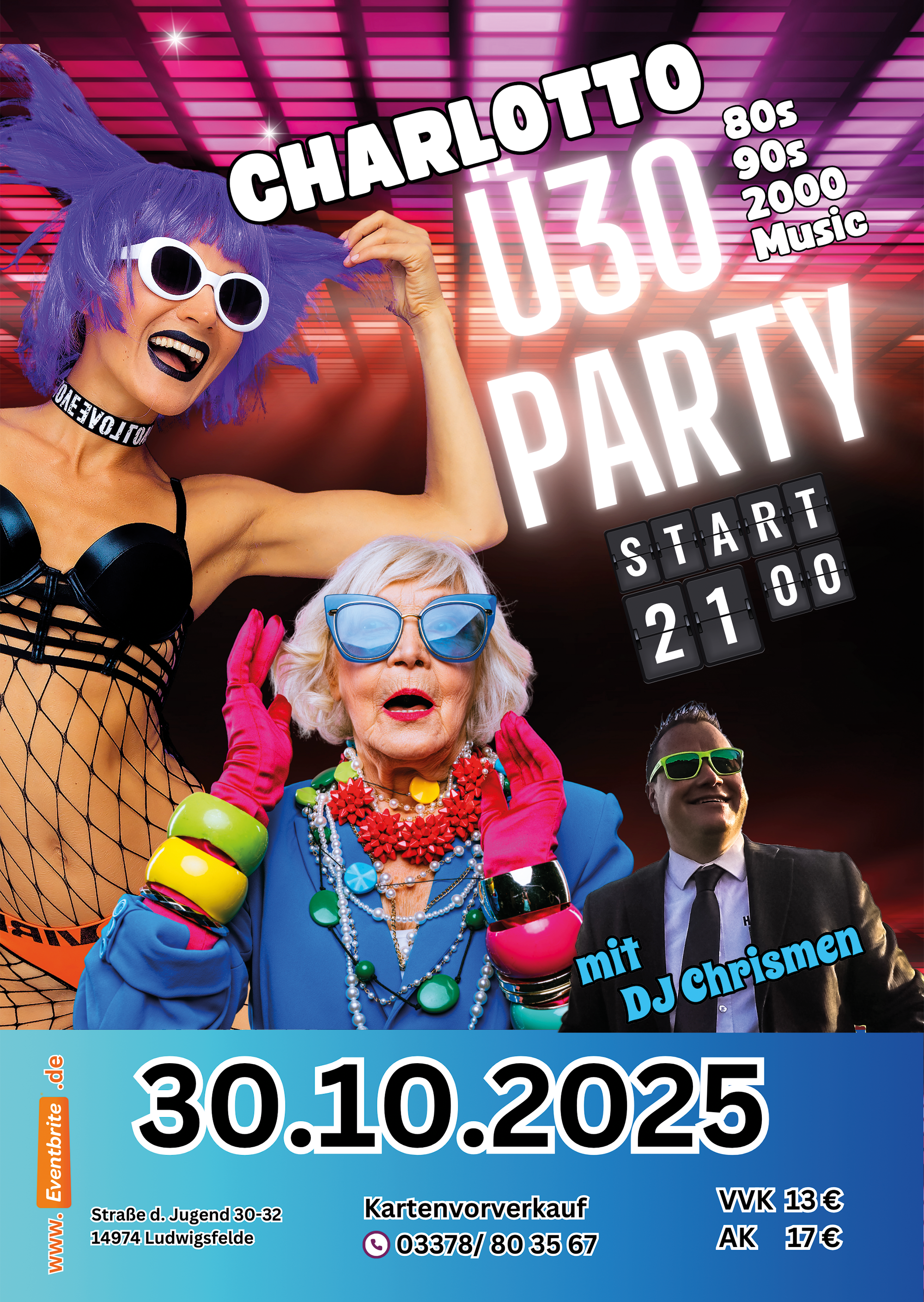 Komm und feiere mit uns die legendäre Ü30 Party! Die Party startet am Donnerstag , den 30.10.2025 um 21:00 Uhr (Nächster Tag Feiertag in Brandenburg) in der angesagtesten Location der Stadt im "Charlotto" Straße der Jugend 30-32, 14974 Ludwigsfelde .