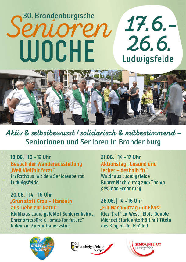 Im Rahmen der 30. Brandenburgischen Seniorenwoche vom 17. bis 26. Juni 2024 lädt das Ehrenamtsbüro und der Seniorenbeirat in Kooperation mit "omas for future" zu einer interessanten Zukunftswerkstatt ein, in deren Zentrum die Frage steht, wie jede/r einzelne Ludwigsfelder/in durch sein/ihr Alltagsverhalten zum Erhalt der Lebensgrundlagen in unserer Stadt beitragen kann.