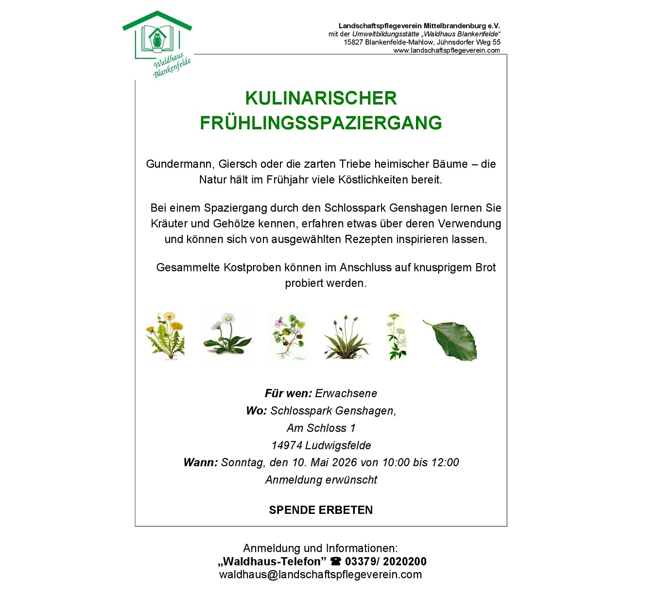Bei einem Spaziergang durch den Schlosspark Genshagen lernen Sie Kräuter und Gehölze kennen, erfahren etwas über deren Verwendung und können sich von ausgewählten Rezepten inspirieren lassen. Gesammelte Kostproben können im Anschluss auf knusprigem Brot probiert werden. Für Erwachsene. Spende erbeten.