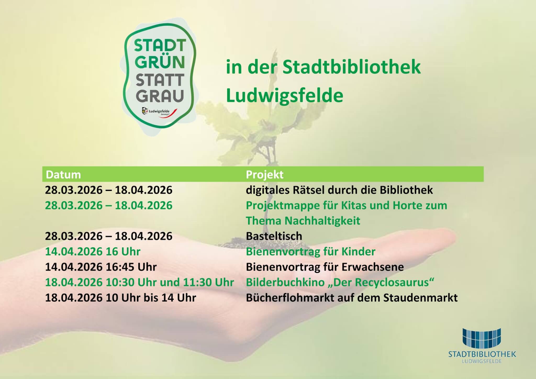 Zusätzlich sorgt der Förderverein der Stadtbibliothek für spannende Aktionen: Bis zum 02.04. können neue Gartenbuch-Wünsche eingereicht werden, die am 23.04., dem Welttag des Buches, feierlich übergeben werden. Am 11.04. findet außerdem ein Bücherverkauf statt – perfekt zum Stöbern und Mitnehmen.
