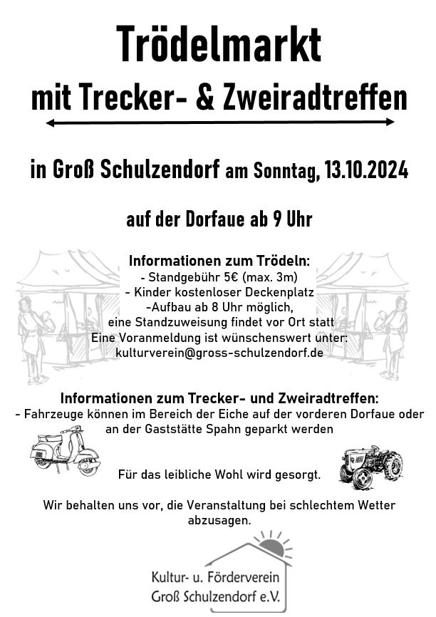 Eine Standzuweisung findet vor Ort statt Eine Voranmeldung ist wünschenswert unter: kulturverein@gross-schulzendorf.de