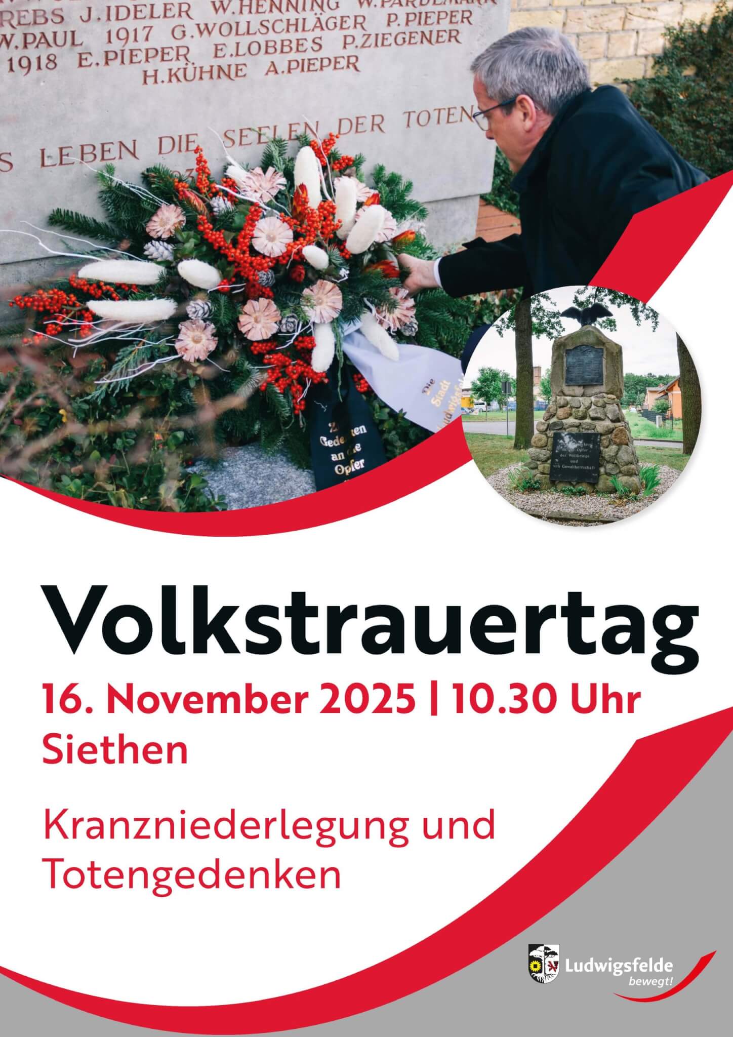 Auch in diesem Jahr lädt die Stadt Ludwigsfelde wieder zu einer Gedenkfeier anlässlich des Volkstrauertages ein. Durch das Erinnern an die vergangenen Kriege ist dieser Tag eine stete Mahnung für den Frieden in der Welt einzutreten. Doch nicht nur weltweit, sondern insbesondere auch in unserer unmittelbaren Umgebung ist es unbedingt erforderlich, sich ständig für ein friedliches Miteinander einzusetzen.