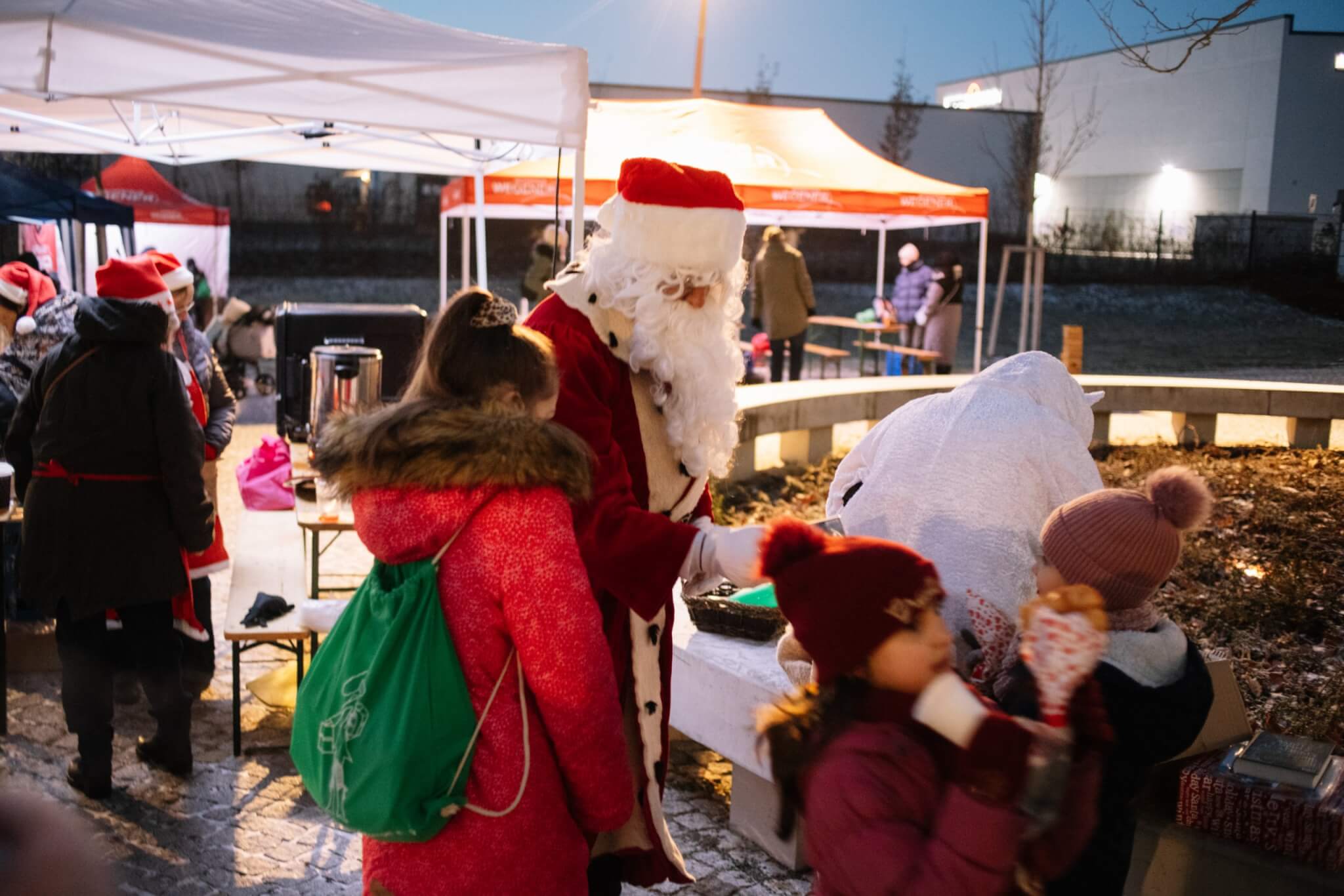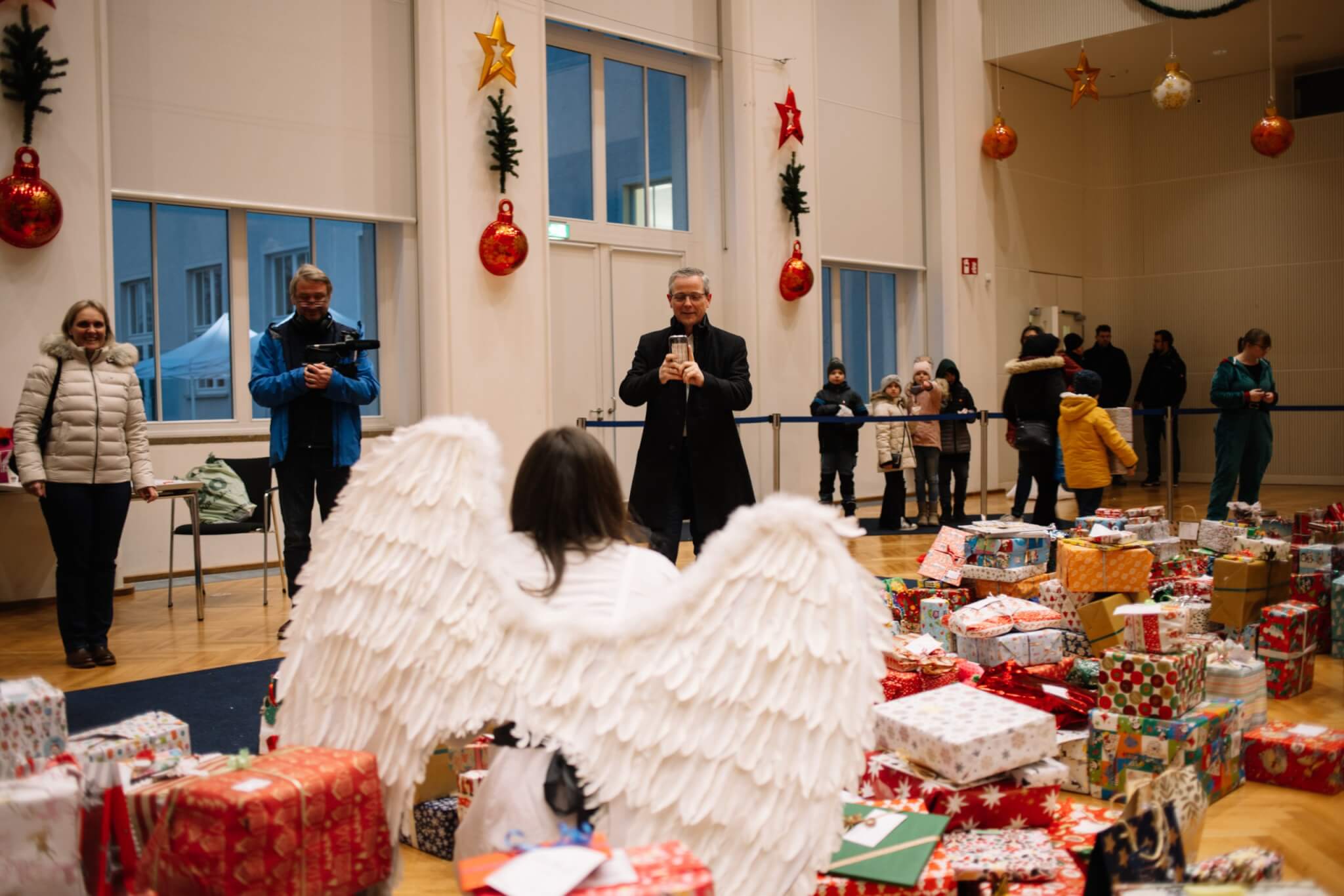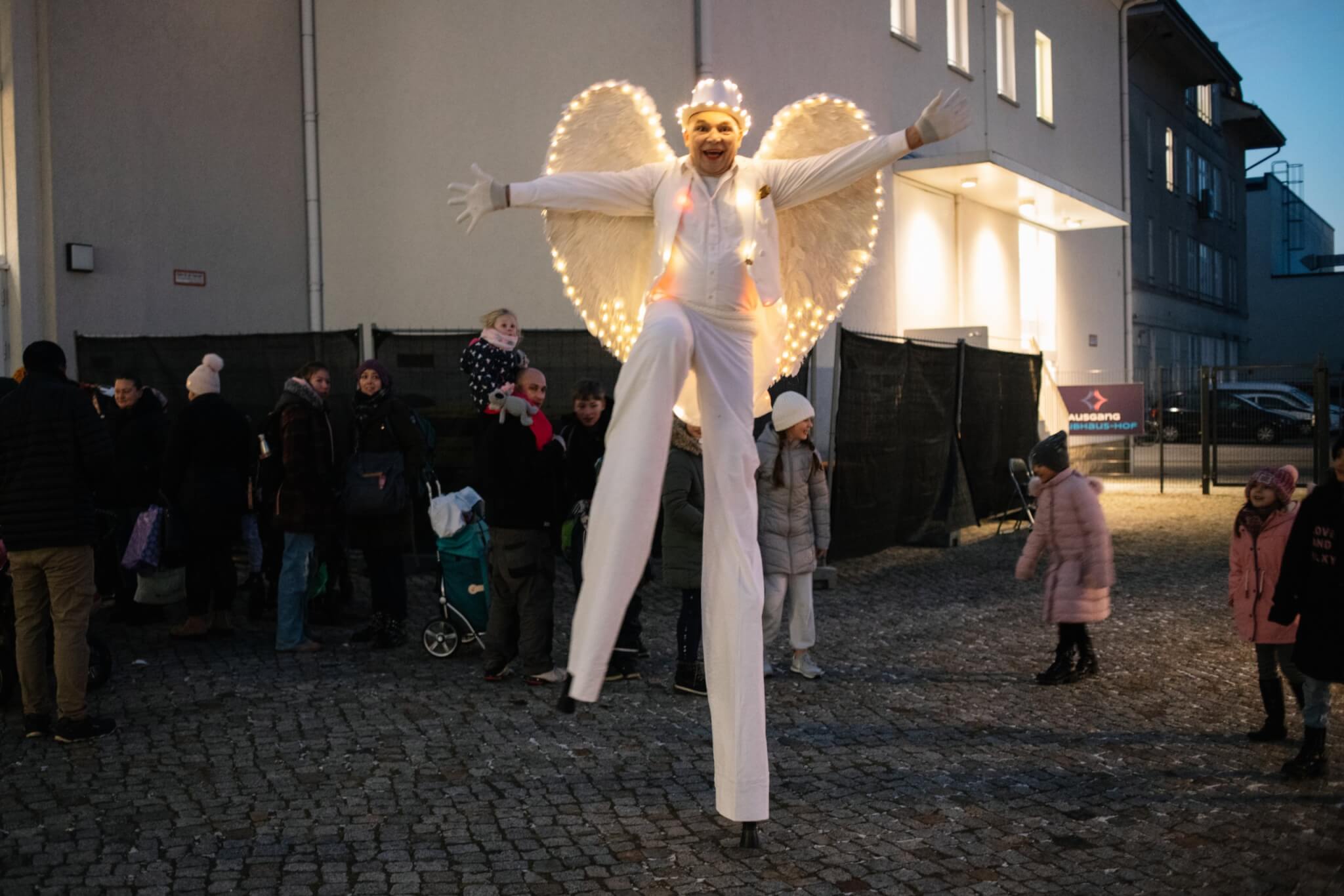 Doch damit nicht genug. Schon kurz nach Beginn der Veranstaltung tauchte der Weihnachtsmann mit einem Eisbären an seiner Seite auf. Nicht nur die Jüngsten machten große Augen, auch die Größeren und sogar der Bürgermeister, der an diesem Nachmittag ebenfalls vorbeischaute, wollten dem Alten mit dem weißen Bart die Hand schütteln oder ein Foto mit ihm machen. Ähnlich ging es auch dem riesigen Stelzenengel. Beide verteilten Bücher und kleine Geschenke.