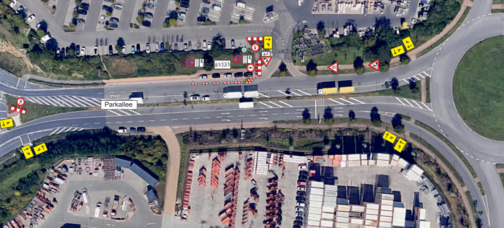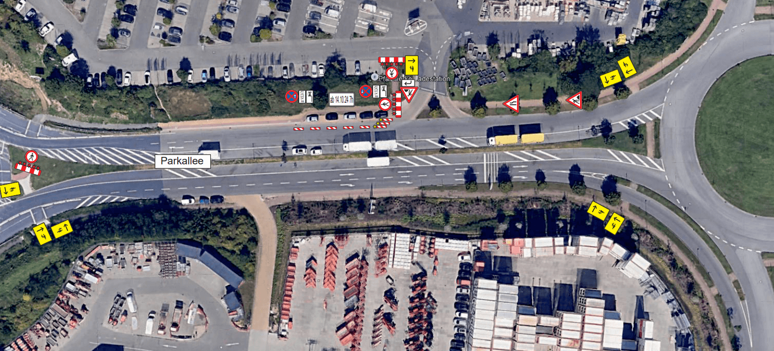 Im ersten Bauabschnitt wird mit der Haltestelle in Fahrtrichtung Süd begonnen. Dazu muss ein Fahrstreifen der Parkallee eingeengt und die Rad- und Fußgängerführung geändert werden. Ab Mitte November, voraussichtlich ab dem 11.11.2024, wird dann die Bushaltestelle in Fahrtrichtung West, direkt vor dem Hornbachmarkt gebaut. Auch für diesen Bauabschnitt muss die Rad- und Fußgängerführung geändert werden.